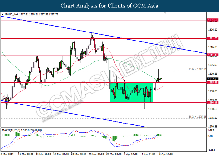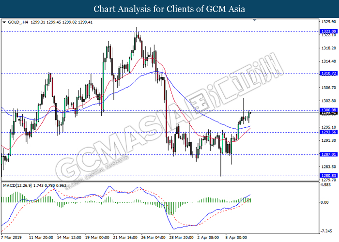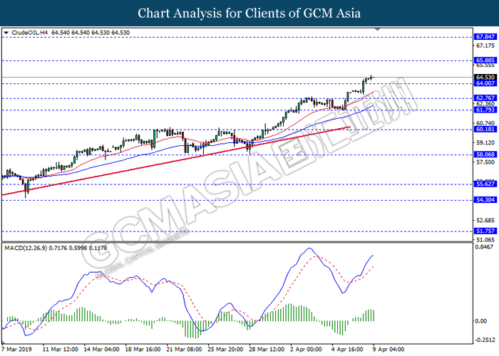 As for commodities market, crude oil price further its gains by 0.16% to $64.50 per barrel after surging more than 2% and hitting a 5-months high yesterday. Crude oil price continues to be supported by growing geopolitical tensions in Libya which may affects its oil production and also continues effort of OPEC+ glut cut. Overall sentiment in the oil market remained positive while investors await further signals from US-Sino trade war which may affect global demand for the commodity. Likewise, gold price increased by 0.14% to $1299.00 a troy ounce following weaker dollar.