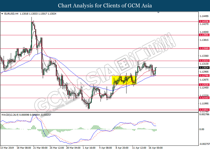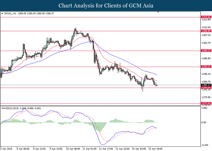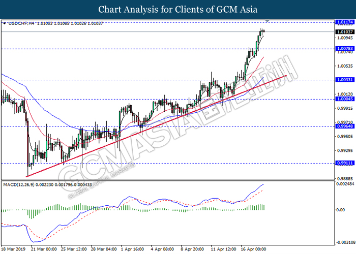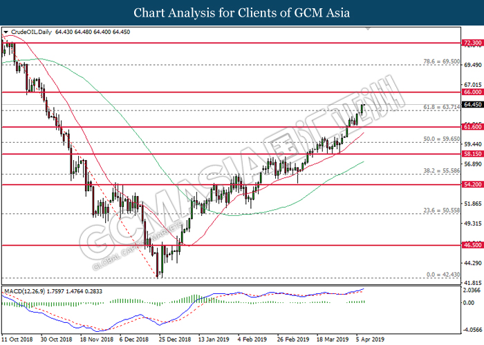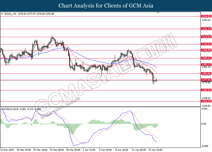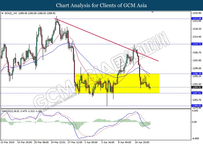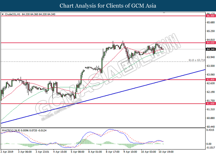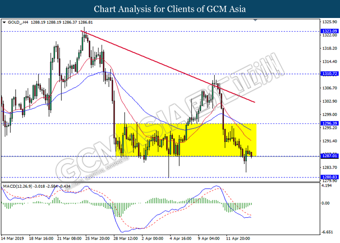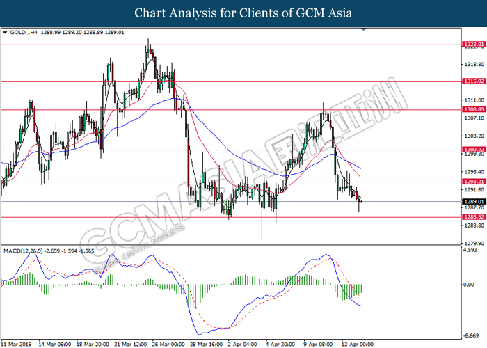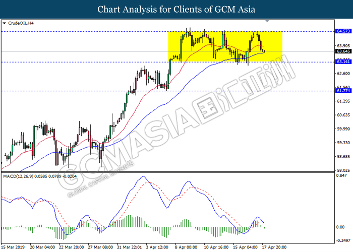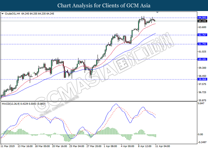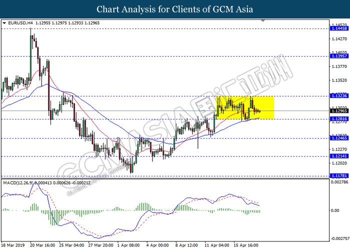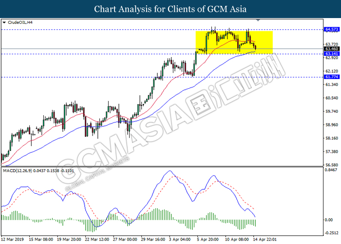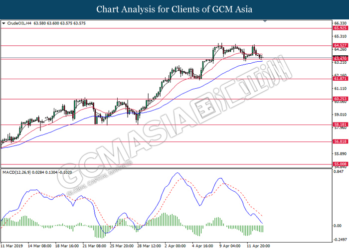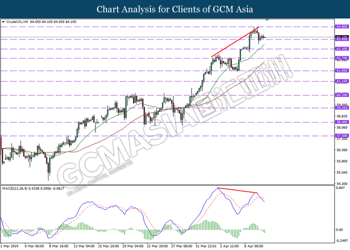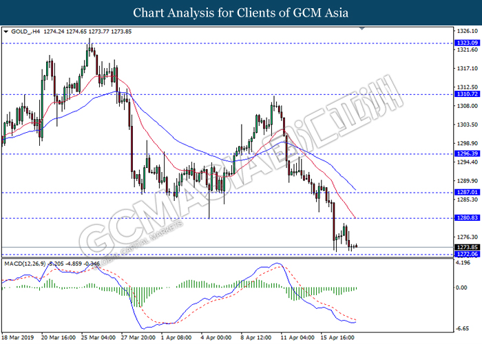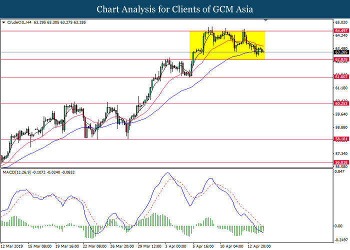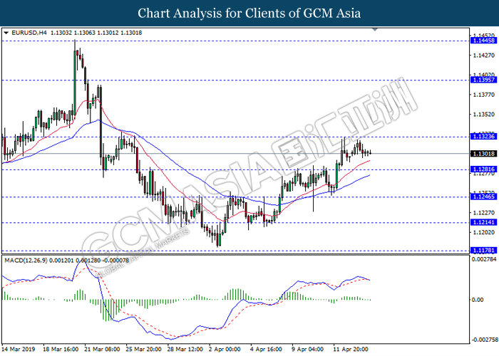 As for commodities, crude oil price rose 0.12% to $64.39 per barrel as of writing following latest supply data. According to reports from American Petroleum Institute (API), crude oil inventories unexpectedly fell by 3.1 million for the week ended April 12. At the same time, tensions in Libya and failing Venezuelan and Iranian exports due to U.S sanctions continue to boosting the appeal of the commodity. However, as recent reports on Moscow to end oil cut deal with OPEC, market will shift their focus towards the development as the ditch will cause heavy disruption in the oil market. On the other hand, gold price extend its losses by 0.08% $1276.10 a troy ounce at the time of writing following investor returned to risk-on mode due to recovering dollar and Venezuela heavy dump on the yellow metal.
