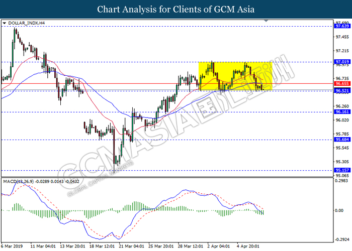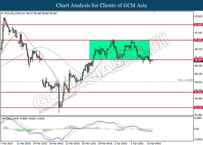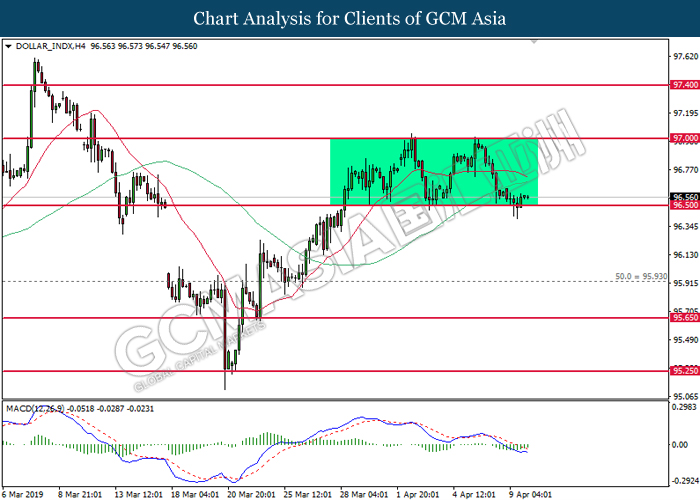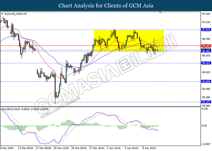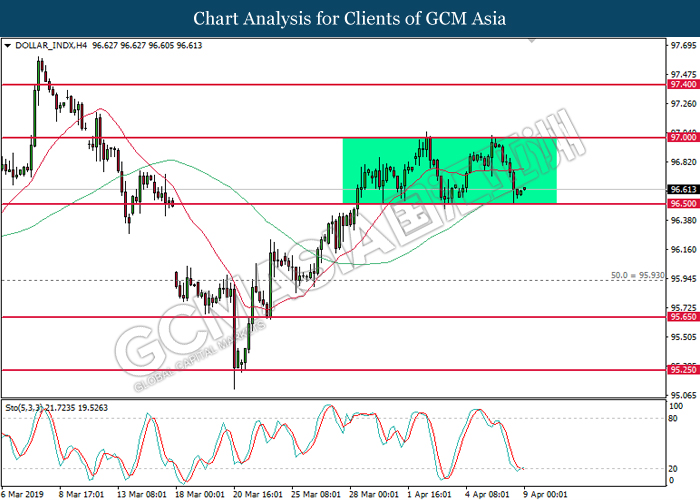 US dollar fell against other major currencies on Monday following a slight decline in US factory orders which has spark some concerns within the market upon economic growth momentum. The dollar index was quoted down 0.34% to 96.60 as of writing. According to US Commerce Department, US Factory Goods Orders for the month of February shrank within expectation with the reading of -0.5%. The decline in factory orders has raised some concerns over US economic growth momentum which is the main topic for the region as of recent. However, losses on the greenback remains limited due to its positive appeal when being compared to pound sterling and euro which are currently facing higher risks ahead such as Brexit and deteriorating economic conditions respectively. On the other hand, pound sterling was traded flat around 1.3060 during Asian trading session. Traders continues to scrutinize further developments of Brexit as UK Prime Minister Theresa May continued her talks with opposition leader Jeremy Corbyn in a bid to break the Brexit impasse. In addition, May is expected to meet with German Chancellor Angela Merkel and French President Emmanuel Macron on Tuesday in order to secure an extension to Brexit deadline which is being set on 12th April.