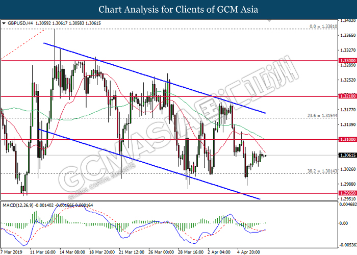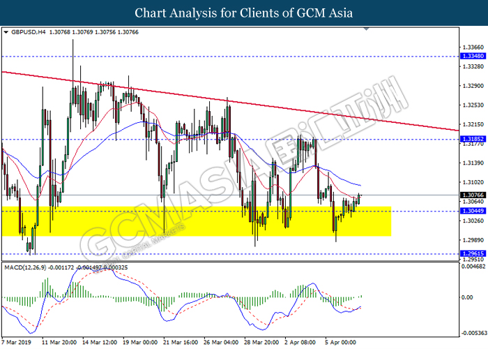 GBPUSD, H4: GBPUSD was traded higher following prior rebound from the lower level. MACD which illustrate diminishing bearish momentum suggest the pair to be traded higher in short term toward the resistance level at 1.3065.
