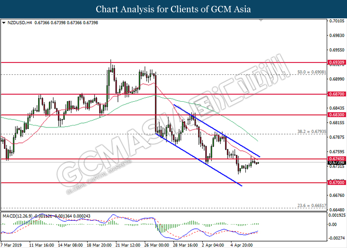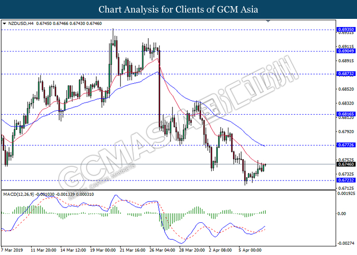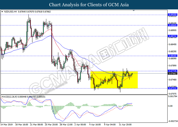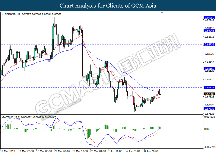 NZDUSD, H4: NZDUSD was traded higher following prior rebound from the 20 MA-line (green). MACD which display bullish momentum suggest the pair to extend its rebound towards the resistance level 0.6775.