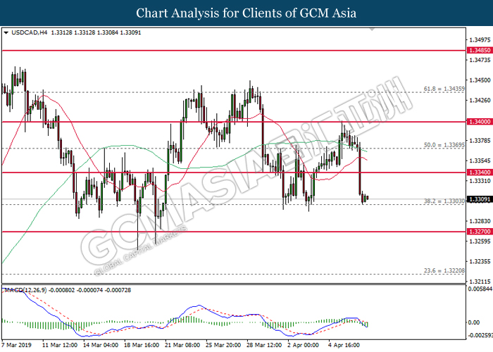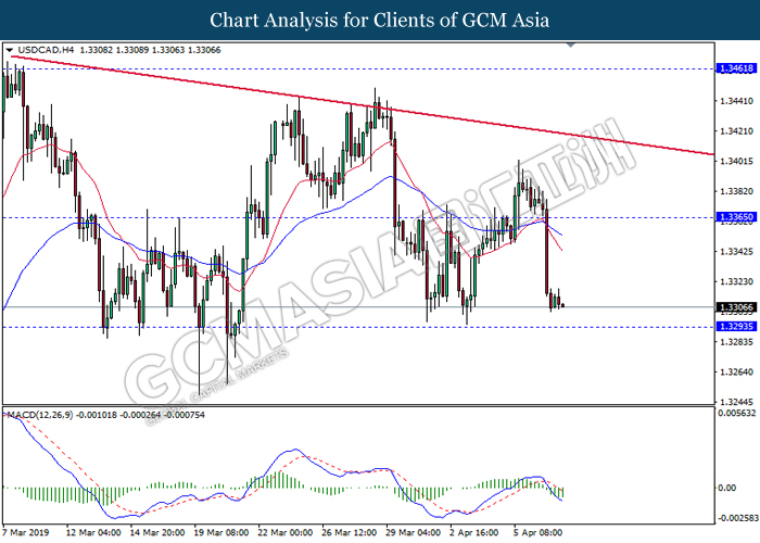 USDCAD, H4: USDCAD was traded lower while currently testing near the support level of 1.3300. MACD which illustrate bearish signal suggests the pair to extend its losses after closing below the target of 1.3300.