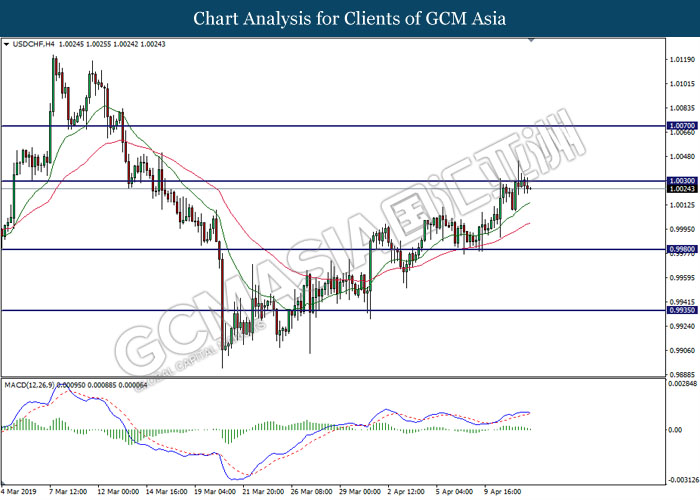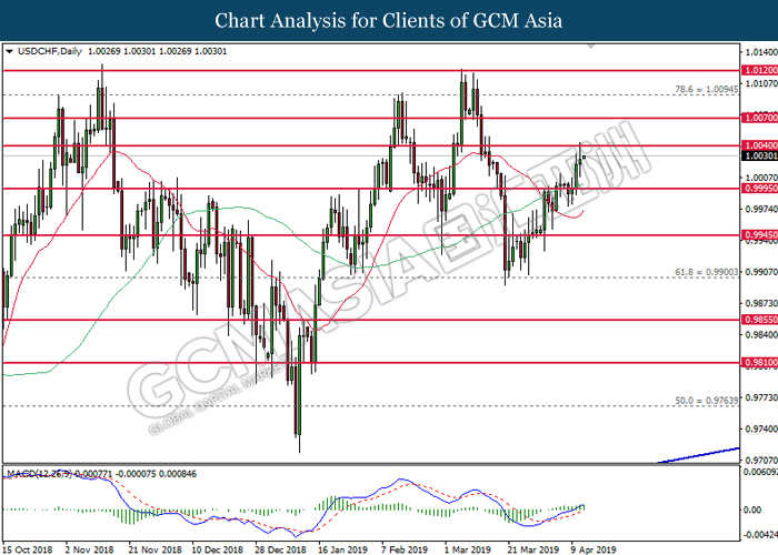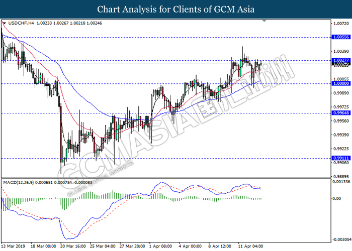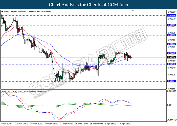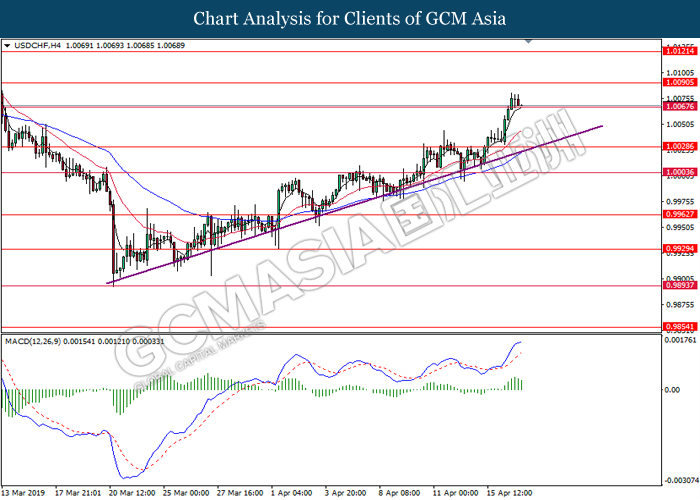 USDCHF, H4: USDCHF was traded lower while currently testing the support level at 1.0065. MACD which display diminishing bullish momentum suggest the pair to extend its losses after successfully breakout below the support level at 1.0065.