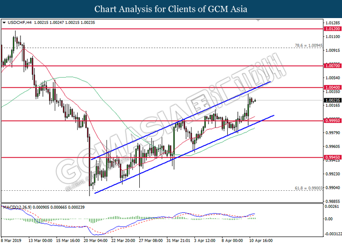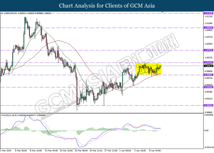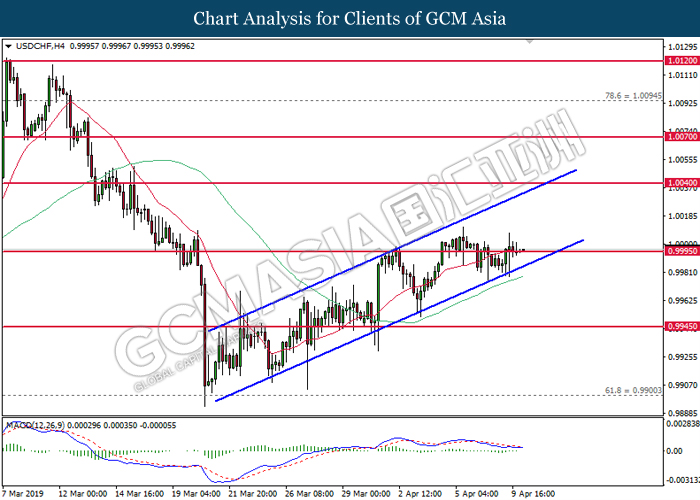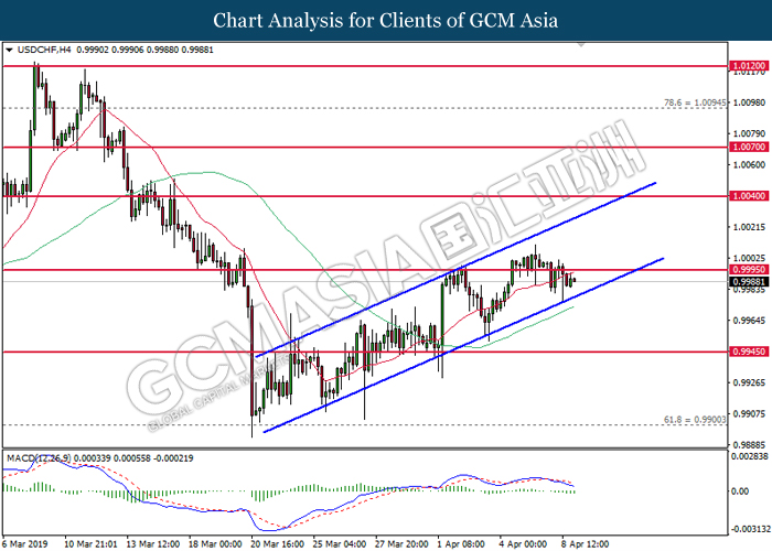 USDCHF, H4: USDCHF remains traded within an ascending channel following prior rebound from the bottom. MACD which illustrate diminishing downward momentum suggests the pair to extend its gains in short-term after closing above 0.9995.