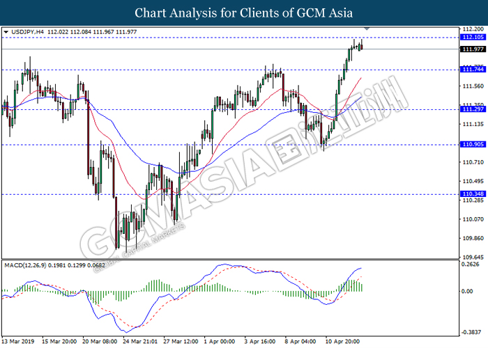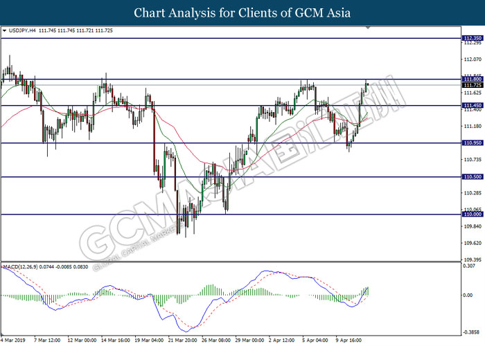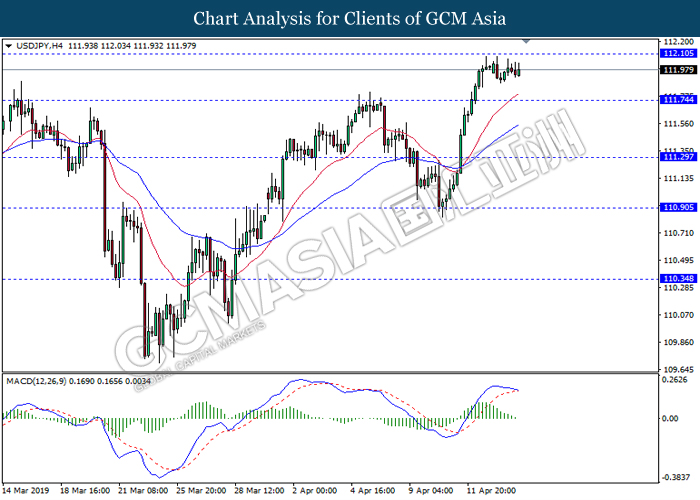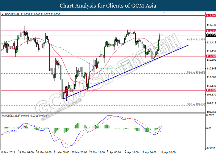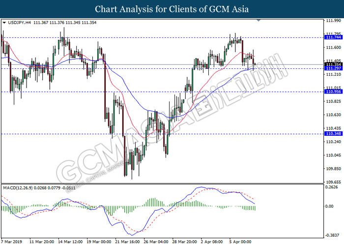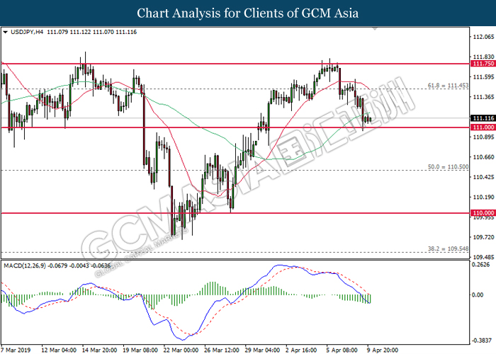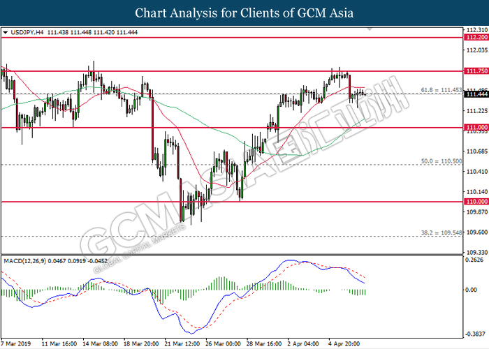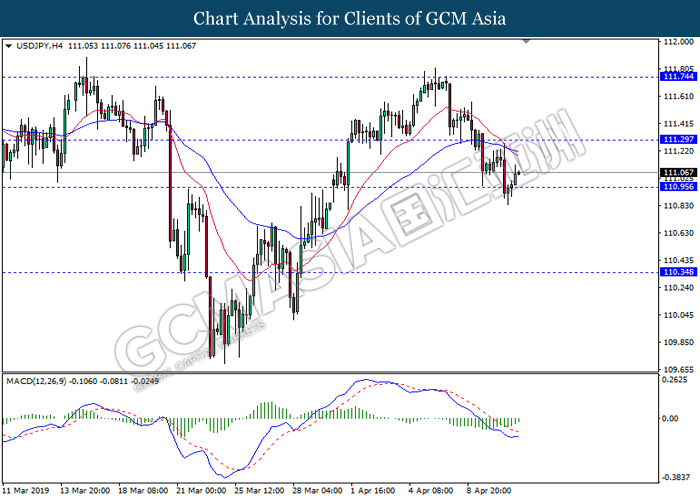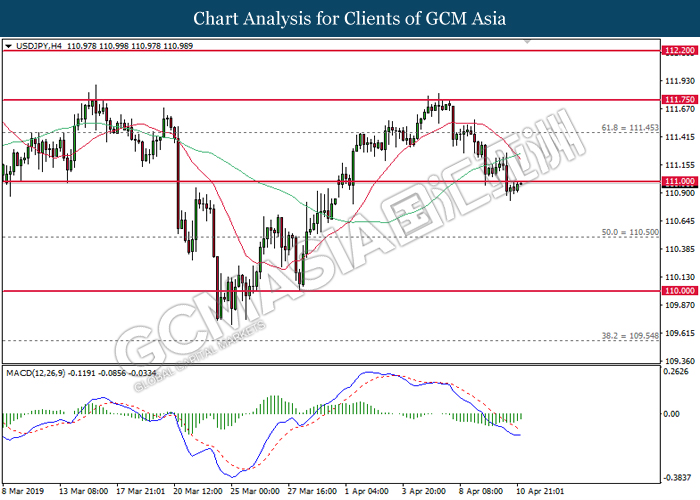 USDJPY, H4: USDJPY was traded lower while currently testing near the support of 111.00. MACD which illustrate bearish signal suggests the pair to extend its losses after closing below the target at 111.00.