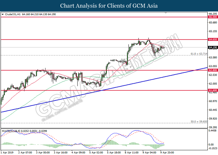 CrudeOIL, H1: Crude oil price was traded higher following prior rebound from the support of 63.70. MACD which illustrate diminished downward momentum suggests its prices to advance further up after closing above the 20-MA line (red).