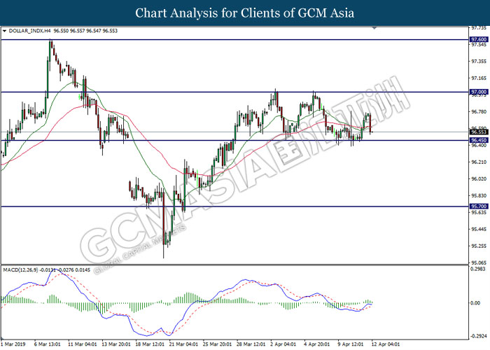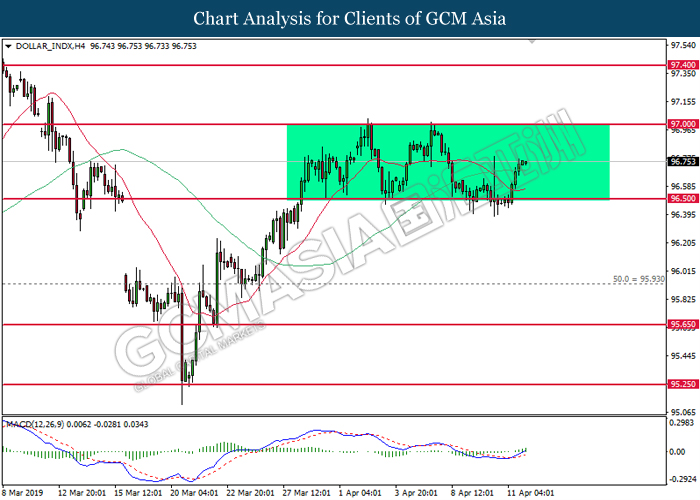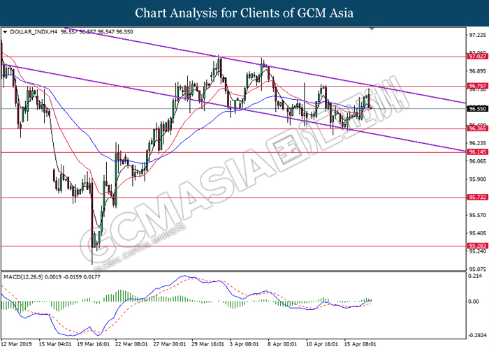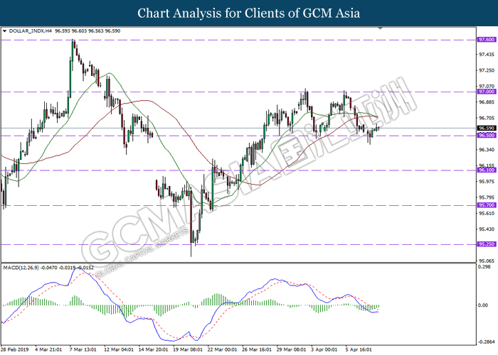 DOLLAR_INDX, H4: Dollar index was traded higher following prior rebound from the strong support near 96.50. MACD which illustrate diminished downward momentum suggests the index to be traded higher in short-term.