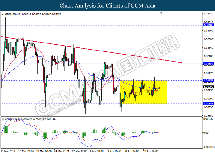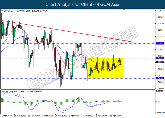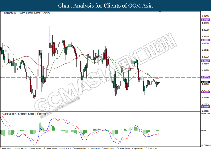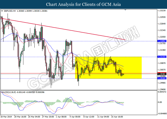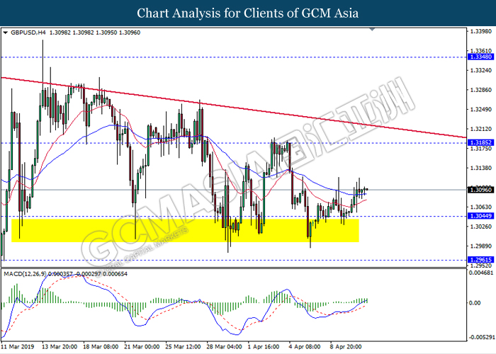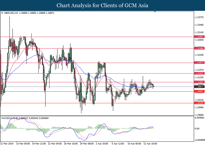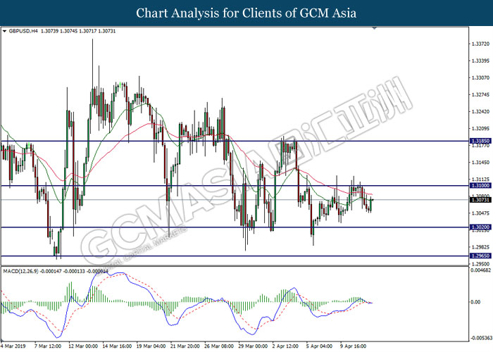 GBPUSD, H4: GBPUSD remain traded in a sideway channel while currently testing near the support level 1.3020. However, MACD which illustrate diminishing bearish momentum suggest the pair to be traded higher in short term towards the resistance level 1.3115.