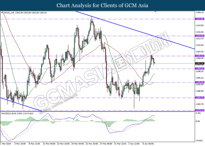 GOLD_, H4: Gold price was traded lower following prior retracement from the resistance level 1305.50. MACD which illustrate diminishing bullish momentum suggest gold to extend its retracement towards the support level 1299.50.