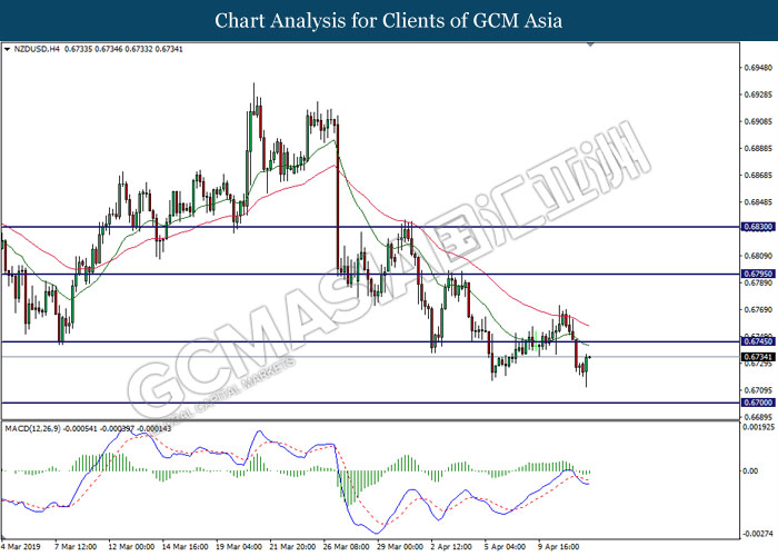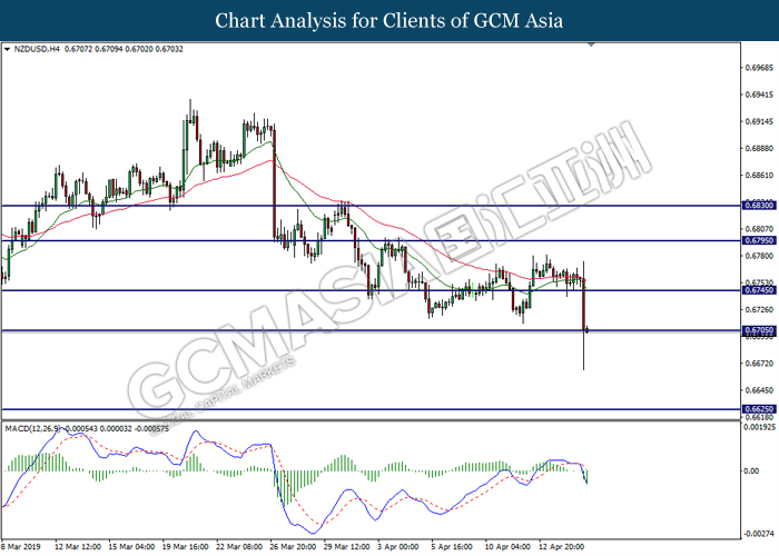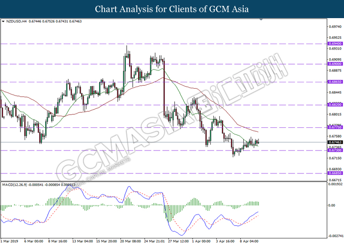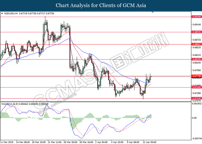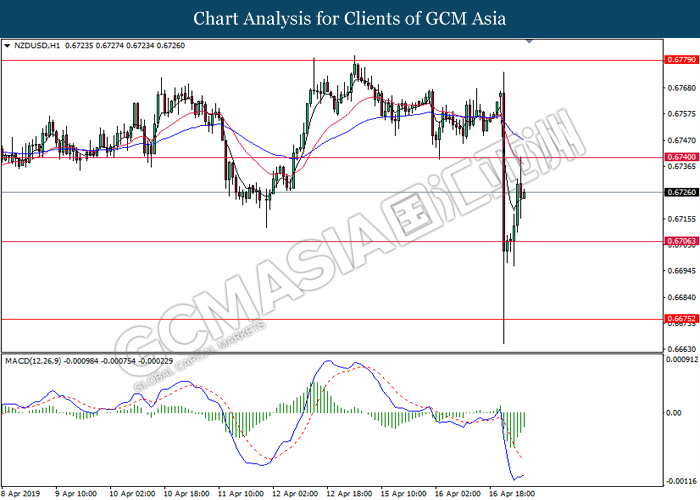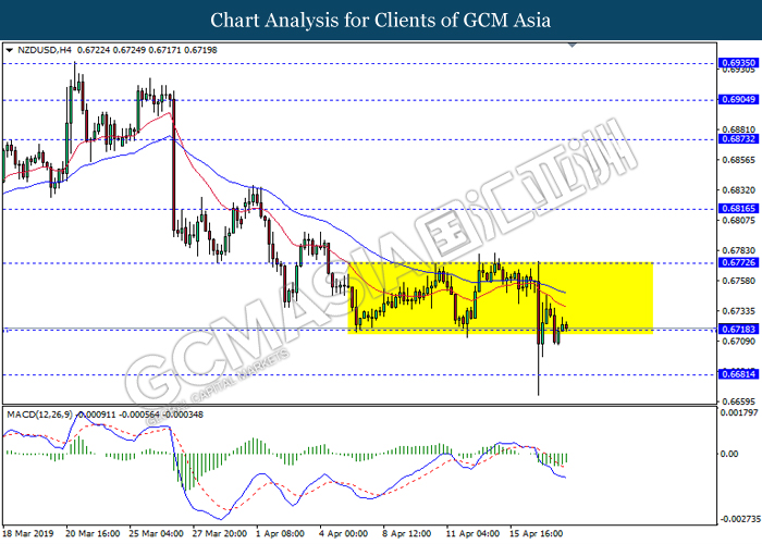 Greenback measuring its value against a basket of six major currency pairs inched higher 0.08% to 96.72 as of writing despite recent weak release of U.S Industrial Production data. According to the Board of Governors of the Federal Reserve, production in U.S factories and manufacturing have slumped to -0.1%, weaker than market expectation with the reading of 0.2% which added to expectations of FED to stay on pause for policy rate plans. However, sentiment remains positive following the rise of U.S equity and treasury yields help supporting the greenback currently. Investors will continue to focus on upcoming developments and data that could affect the U.S market conditions to determine further direction. On the other hand, New Zealand Kiwi suffered huge loss and plummeted 0.83% to 0.6703 at the time of writing following disappointing CPI. According to the official data release by Statistics New Zealand, the CPI figure came in 0.1%, lagging behind the forecasted reading of 0.3% which further strengthening the expectations of RBNZ’s rate cut plan in May. Besides that, RBNZ Governor Adrian Orr also stated in his interview that the New Zealand Kiwi is in “happy space” and possibility Q1 inflation undershooting forecasts already factored into bank’s dovish bias.