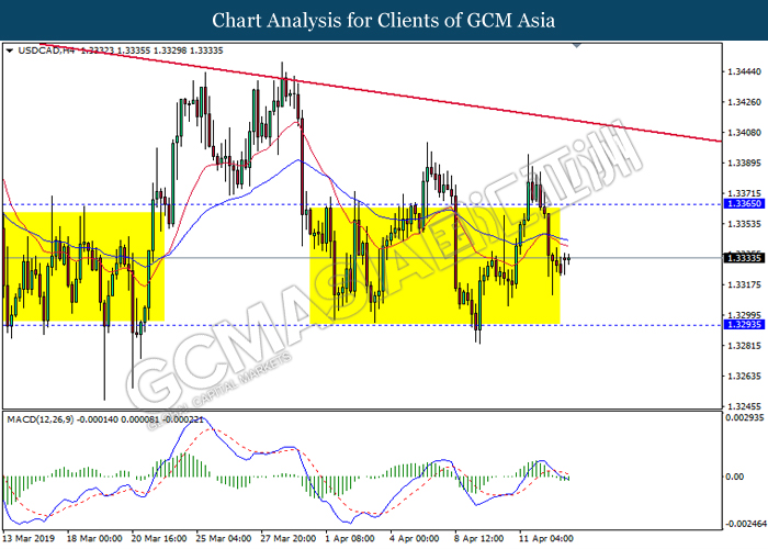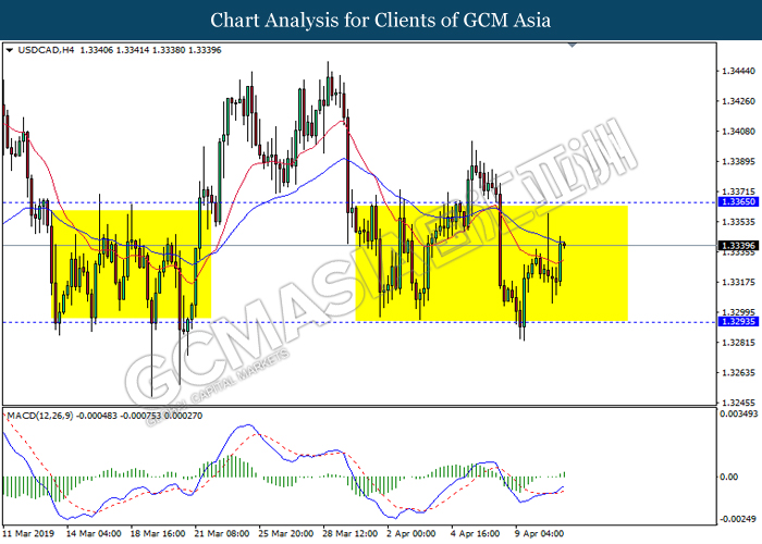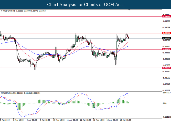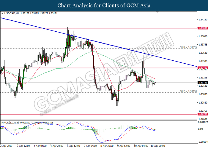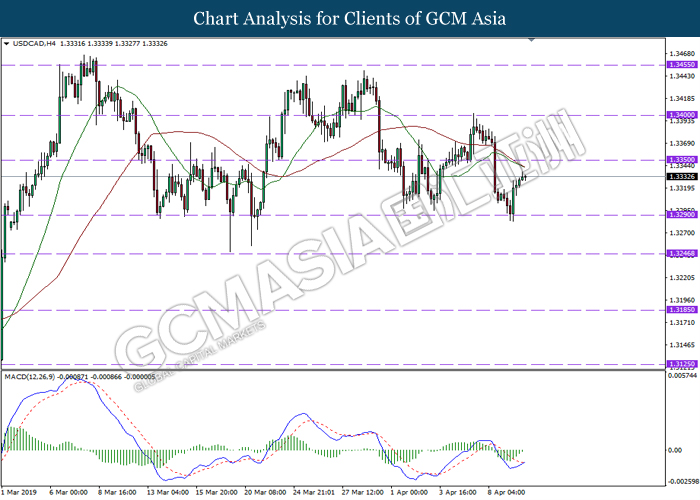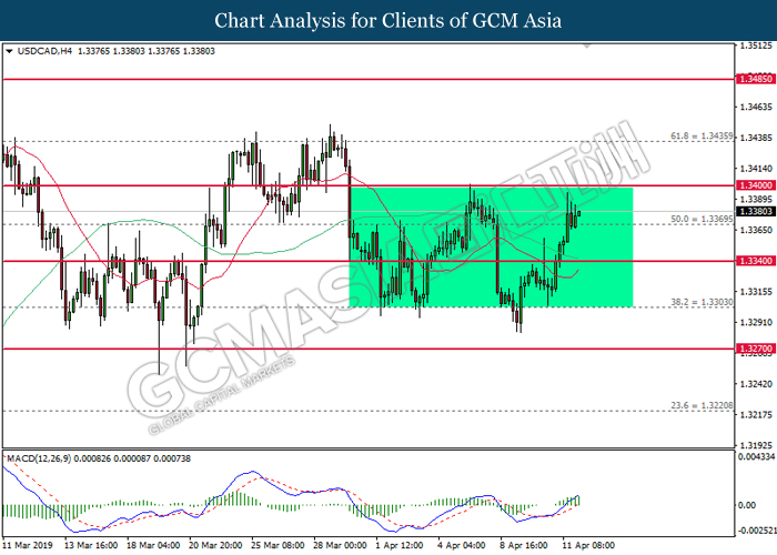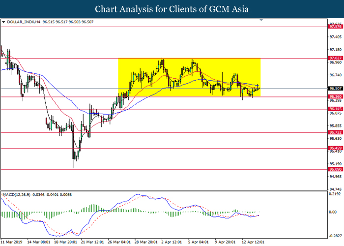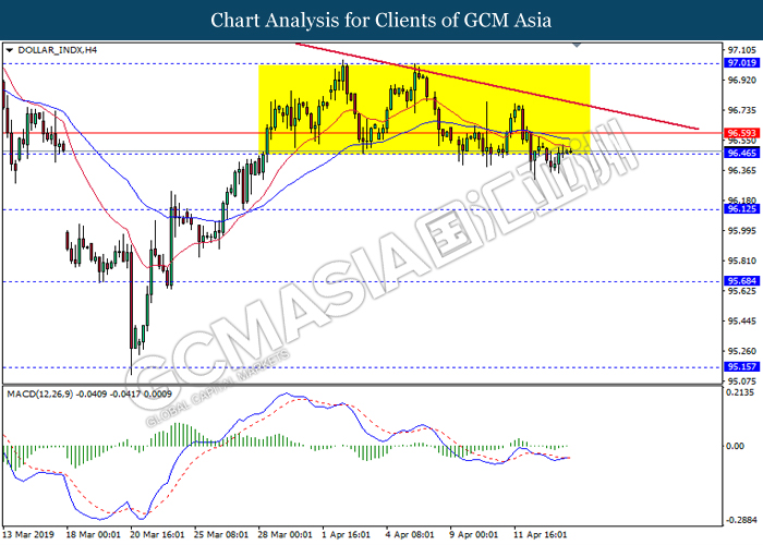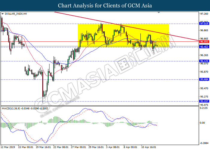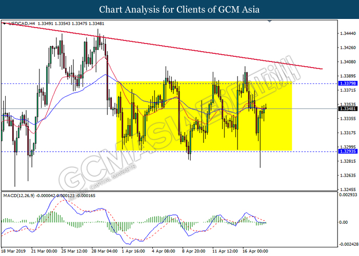 Dollar index which measures its strength against a basket of six major currency pairs edged higher by 0.02% to 96.62 during early Asian trading session after traded flat on Wednesday. With most of the major markets getting ready for their Good Friday holiday, the lack of momentum in the market caused investors to be cautious while awaiting further catalyst to gauge the market. According to recent trade war developments, both US and Chinese officials are currently scheduling more face-to-face trade talks in hope to reach a deal by May. US Trade Representative Robert Lighthizer and Secretary Steven Mnuchin plan to travel to Beijing during the week of April 29 while Chinese Vice Premier Liu He is expected to travel to Washington the week after for further negotiations and hopefully to reach a deal by then. In other news, pair of USD/CAD was up by 0.09% to 1.3350 following yesterday’s release of poor Core CPI data. The inflation data fell to 0.3% from previous reading of 0.7% which spiraled fears that Canada’s Central Bank (BoC) might suggest for a rate cut in their policy meeting due next week. Besides that, pressure in the oil market further weakened the asset-backed currency.