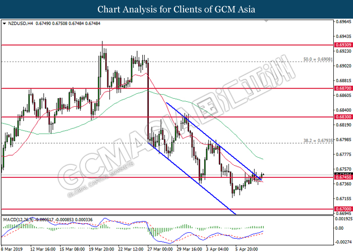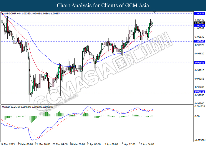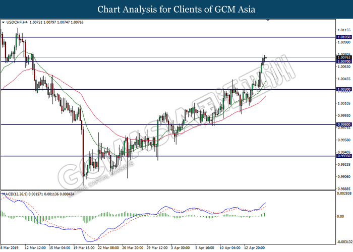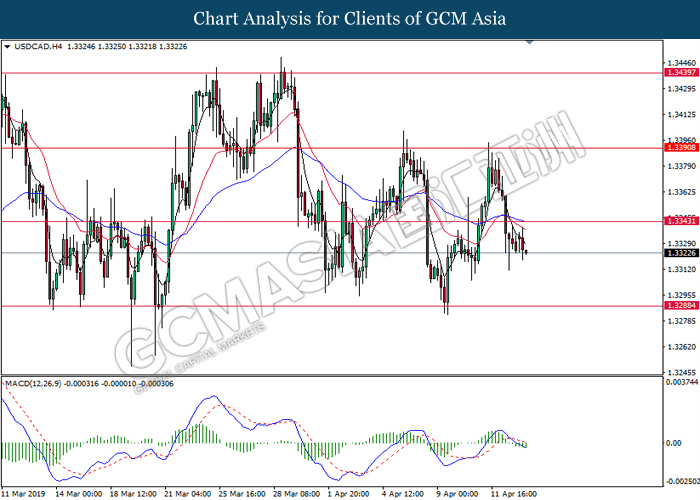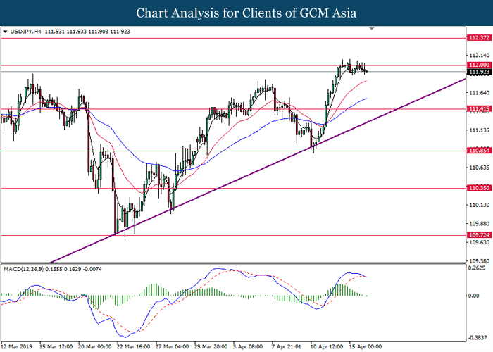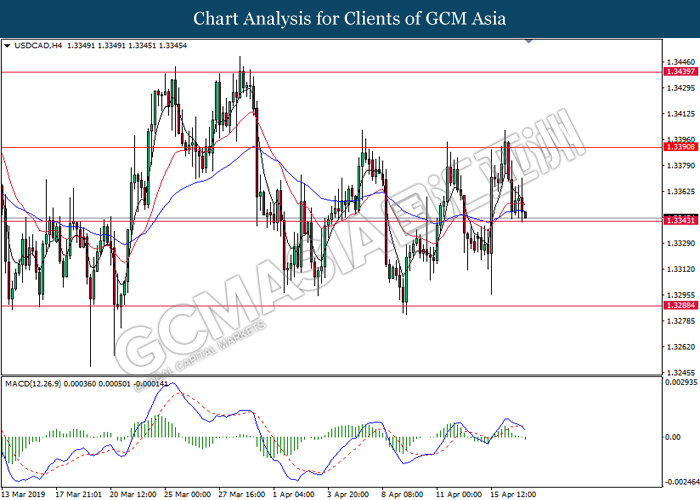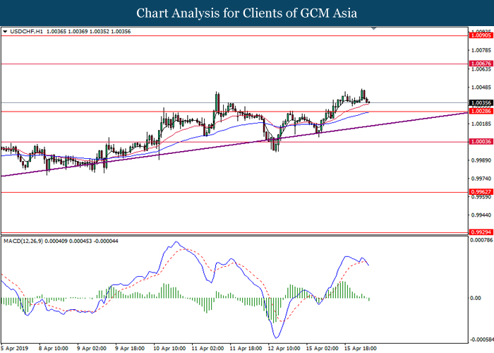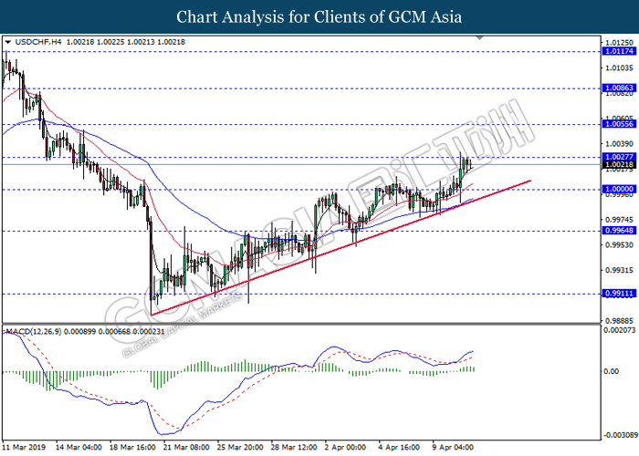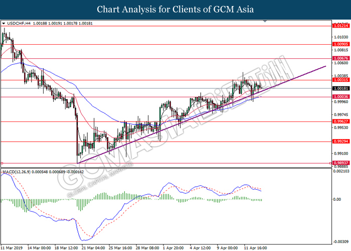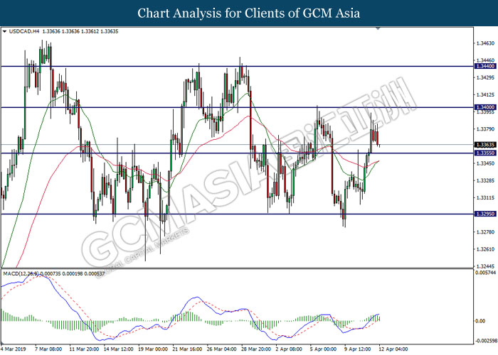 Dollar index which measures its strength against a basket of six major currency pairs edged higher by 0.02% to 96.62 during early Asian trading session after traded flat on Wednesday. With most of the major markets getting ready for their Good Friday holiday, the lack of momentum in the market caused investors to be cautious while awaiting further catalyst to gauge the market. According to recent trade war developments, both US and Chinese officials are currently scheduling more face-to-face trade talks in hope to reach a deal by May. US Trade Representative Robert Lighthizer and Secretary Steven Mnuchin plan to travel to Beijing during the week of April 29 while Chinese Vice Premier Liu He is expected to travel to Washington the week after for further negotiations and hopefully to reach a deal by then. In other news, pair of USD/CAD was up by 0.09% to 1.3350 following yesterday’s release of poor Core CPI data. The inflation data fell to 0.3% from previous reading of 0.7% which spiraled fears that Canada’s Central Bank (BoC) might suggest for a rate cut in their policy meeting due next week. Besides that, pressure in the oil market further weakened the asset-backed currency.