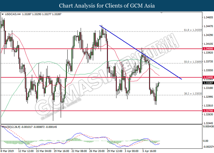 USDCAD, H4: USDCAD was traded higher following prior rebound near the support level of 1.3290. MACD which illustrate bullish bias signal suggest the pair to extend its rebound towards the resistance level 1.3350.