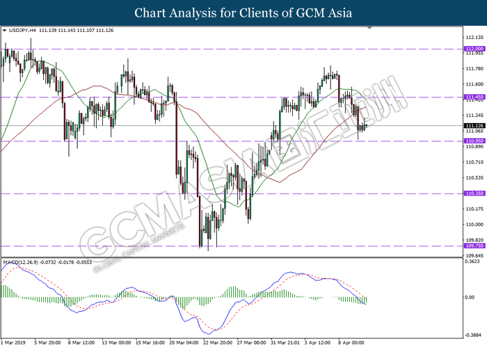 USDJPY, H4: USDJPY was traded higher following prior rebound near the support level 110.95. However, MACD which illustrate bearish momentum suggest the pair to be traded lower back to the support level 100.95.