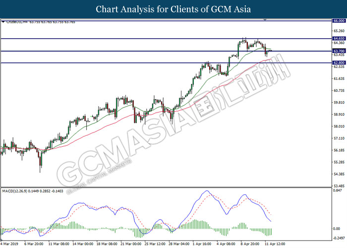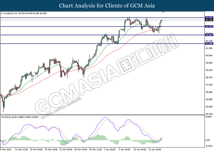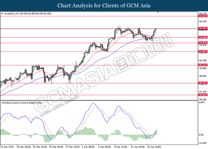 CrudeOIL, H4: Crude oil price was traded higher while currently testing the resistance level at 64.50. MACD which display bullish bias momentum suggest the commodity to extend its gains after successfully breakout above the resistance level at 64.50.