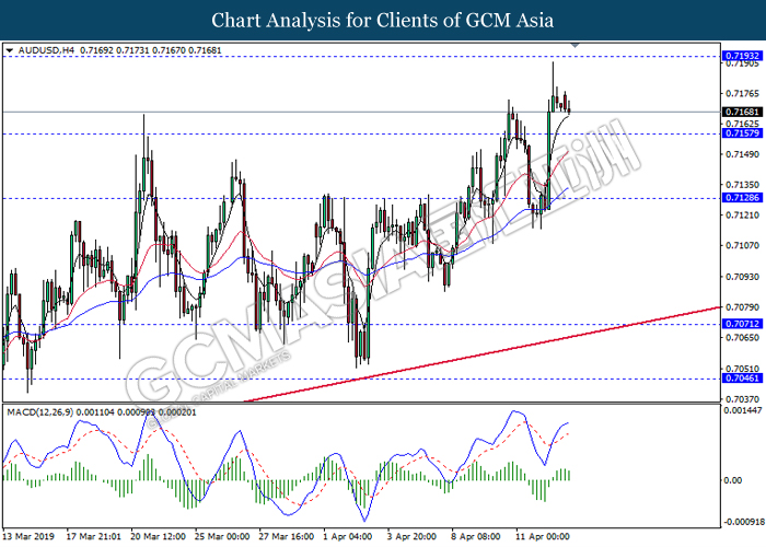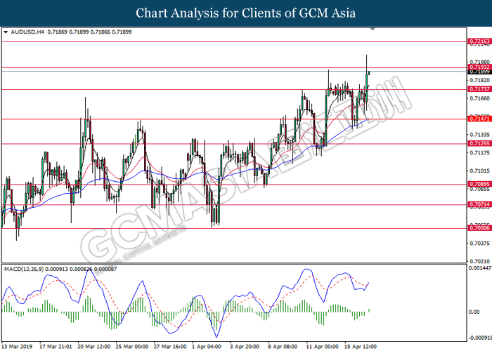 AUDUSD, H4: AUDUSD was traded higher while currently testing the resistance level at 0.7195. MACD which display bullish momentum and the formation of golden cross suggest the pair to extend its gains after successfully breakout the resistance level at 0.7195.