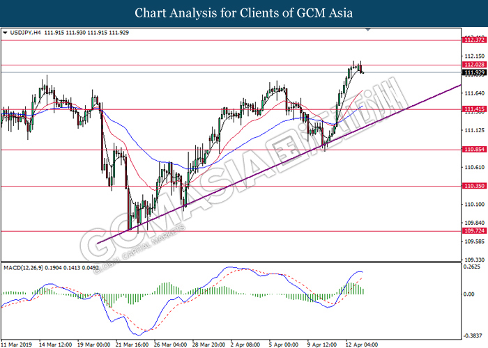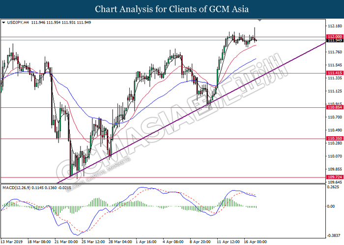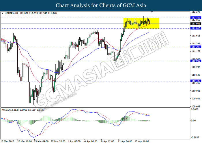 USDJPY, H4: USDJPY remain traded in a sideway channel following recent retracement from the resistance level 112.10. MACD which illustrate bearish momentum signal suggest the pair to extend its retracement towards the support level 111.80.