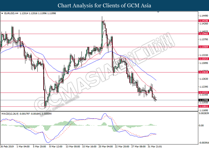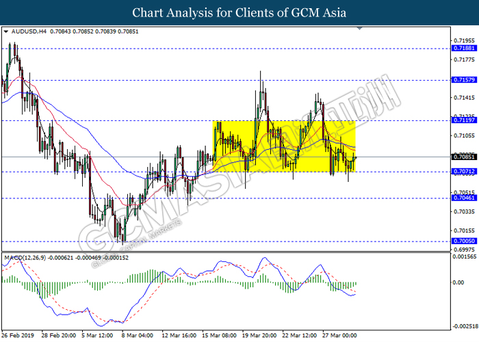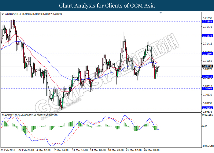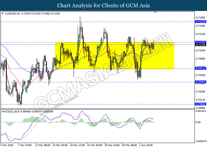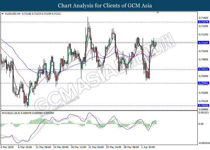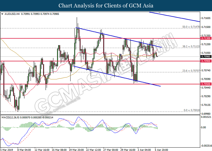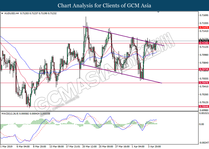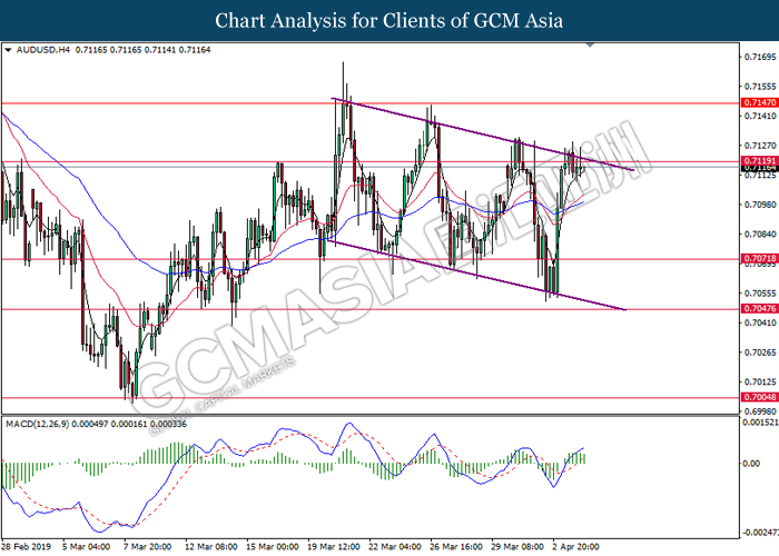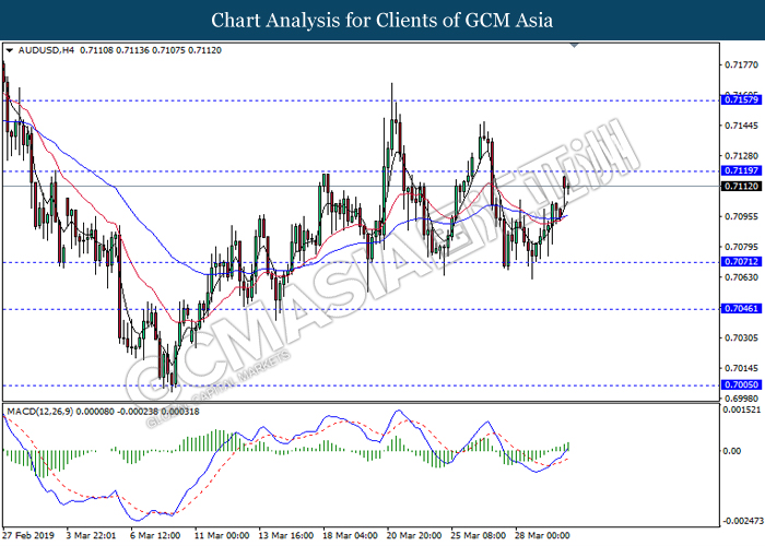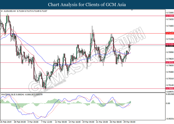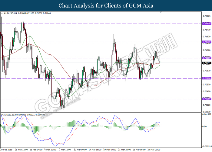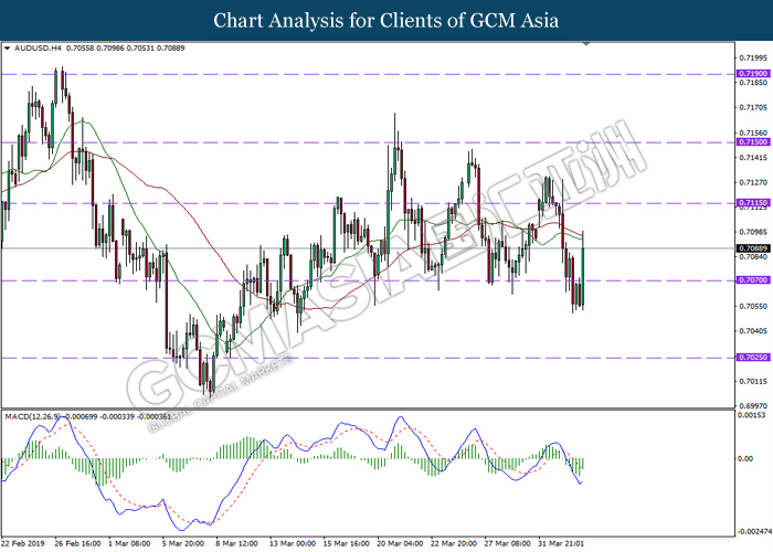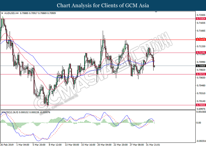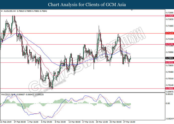 Japanese yen extended its losses during mid-Asian session, buoyed by bearish economic data from the region. For the month of February, Japan’s Household Spending contracted more than expected with -2.0%, missing economist forecast for a contraction up to -0.5%. The data has reiterated Bank of Japan’s projection whereby Japan may fail to achieve its inflation target of 2% within two years. A significant depreciation in household spending may force BoJ to execute more expansionary policy tools in order to support the economy. As such, pair of USD/JPY appreciates by 0.05% to 111.70. On the other hand, pair of AUD/USD rose 0.14% to 0.7121 during Asian trading session. Australian dollar was well in bid after recent comments from the United States and Chinese policymakers shows higher chances to untangle trade tension in between both nations. However, gains on the pair of AUD/USD remains limited as investors places their attention over US Nonfarm Payrolls report which has portrayed outstandingly low reading for February which is deemed to be “too low”.