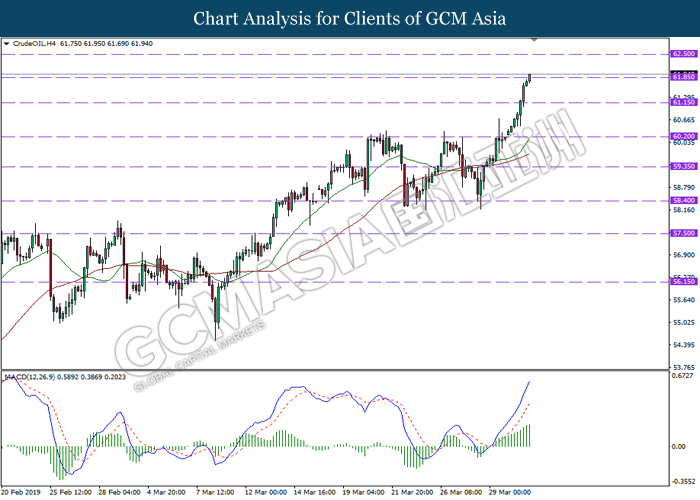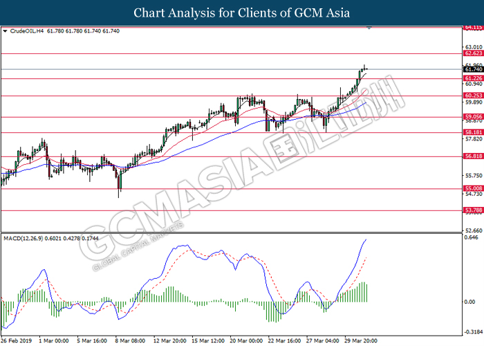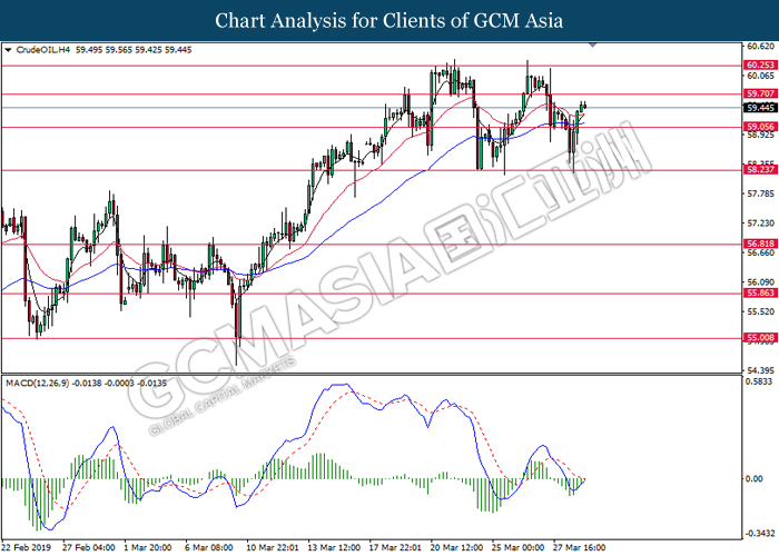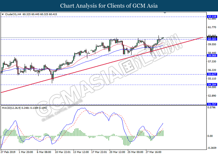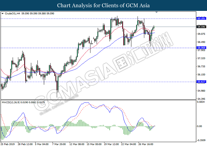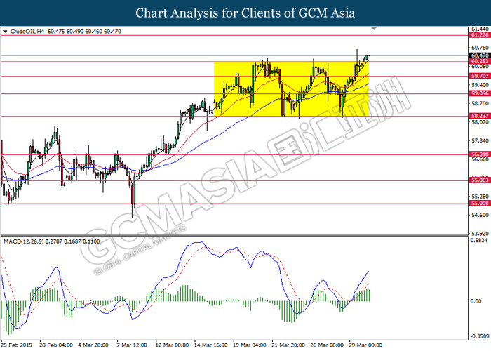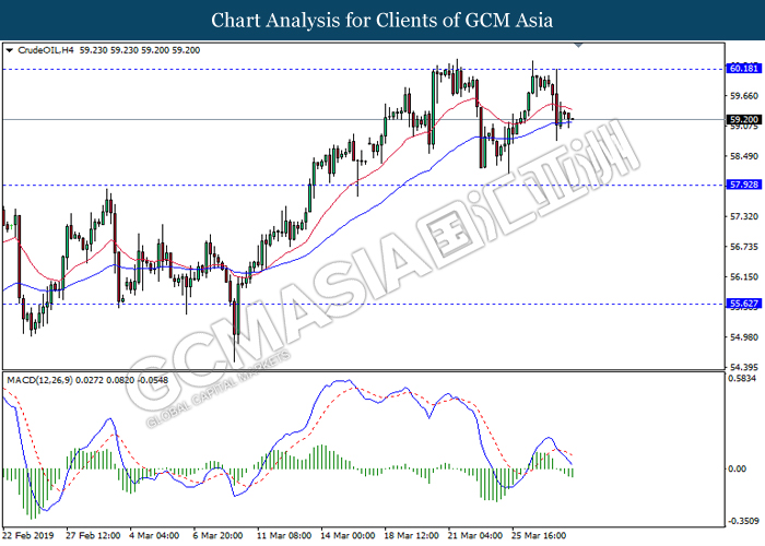 In the commodities market, crude oil price retraced by 0.03% to $59.44 per barrel after extending its gains throughout yesterday amid overall positive sentiment in the market. Recent news reported that US are widening their sanctions on Venezuela oil export, instructing oil traders around the world to further cutting their oil trades with Venezuela or faces sanction themselves. Besides that, continuous effort of production cut from OPEC and its allies continues to provide support for oil prices. Likewise, gold price rose 0.12% to $1291.65 a troy ounce after facing a large sell-off yesterday as Brexit deadlock made dollar’s appeal as a strong safe haven asset.