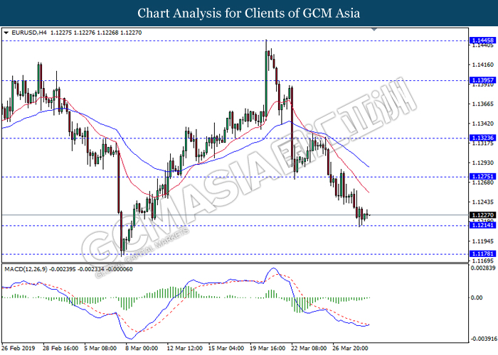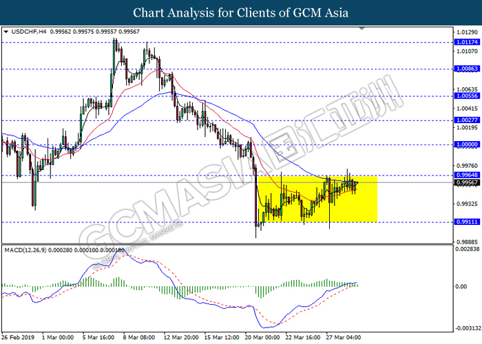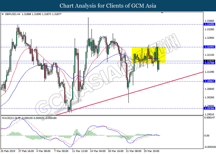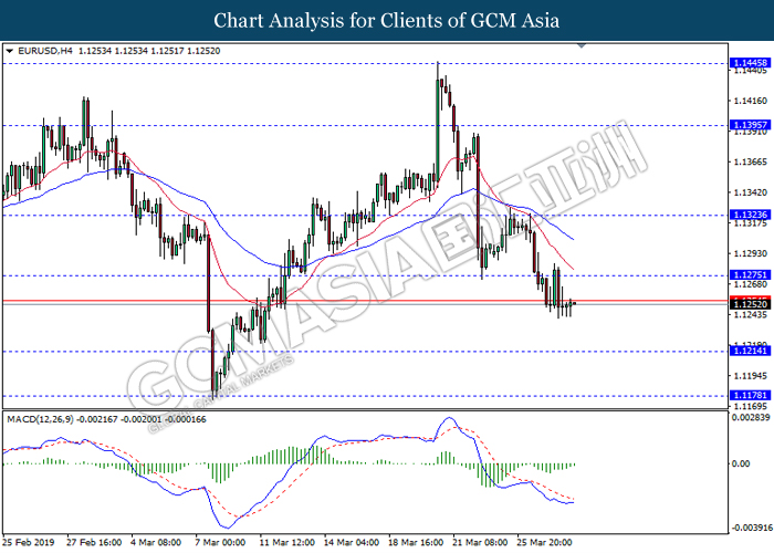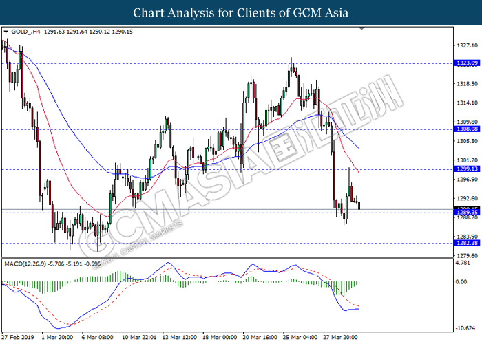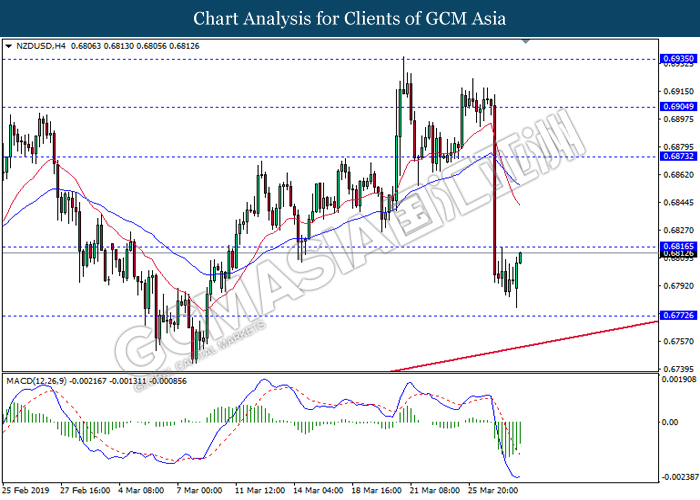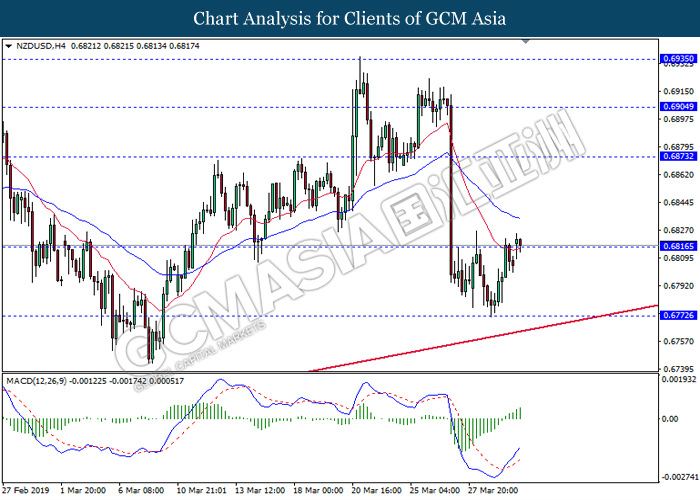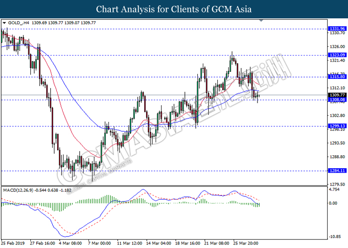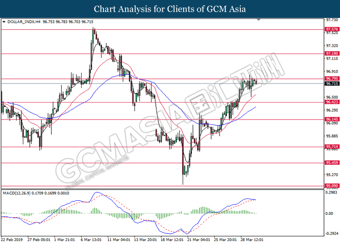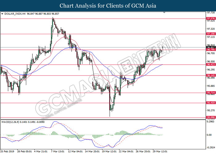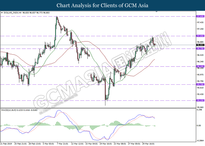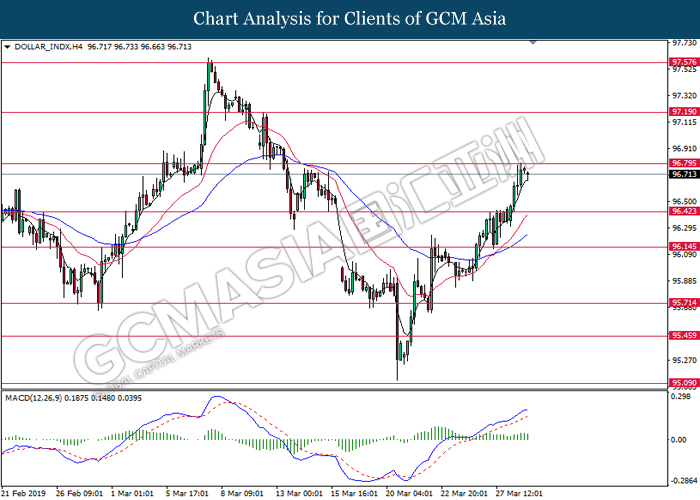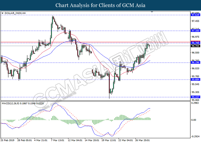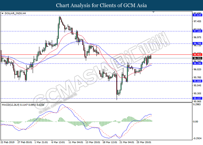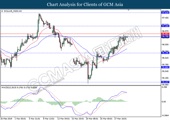 Dollar index measuring against a basket of six major currency pairs was traded lower by 0.03% to 96.76 at early Asian trading session after holding its grounds on Friday amid upbeat housing data and uncertainties arising from Brexit. During last Friday trading sessions, US New Home Sales data came in at 667K, beating economists’ expectations of 620K while indicating a higher housing sales activity as well as better economy outlook. Besides that, Friday’s announcement of higher than expected Michigan Consumer Sentiment with a reading of 98.4 against 97.8 also helped provide further support for the dollar. In other news, pair of GBP/USD fell by 0.10% to 1.3015 while remained pressured by Brexit deadlock. Prime Minister Theresa May faced a third-time defeat for the approval of her Brexit deal with the UK Parliament voting 388 against 286 during Last Friday’s Brexit vote. The UK is now under pressure of deciding whether to approve a Brexit deal before 12th April deadline, to crash out of the union without a deal or to request further delay to the Brexit deadline while remaining in the EU and participating in the next European Union general elections.