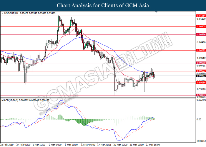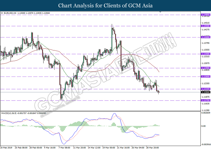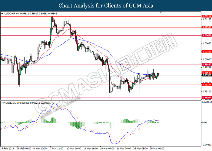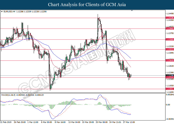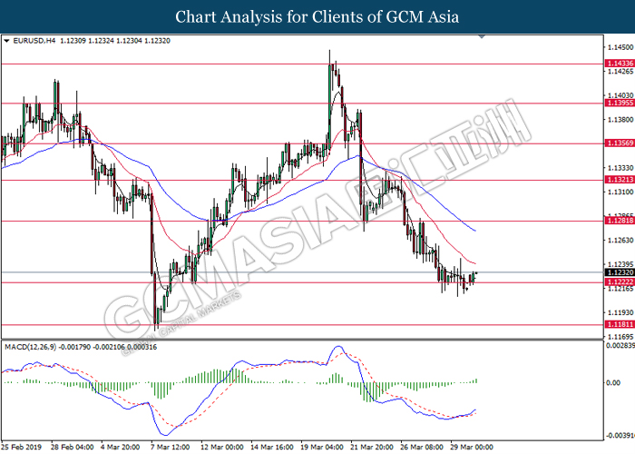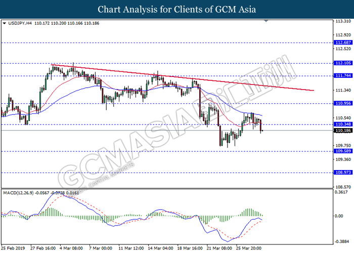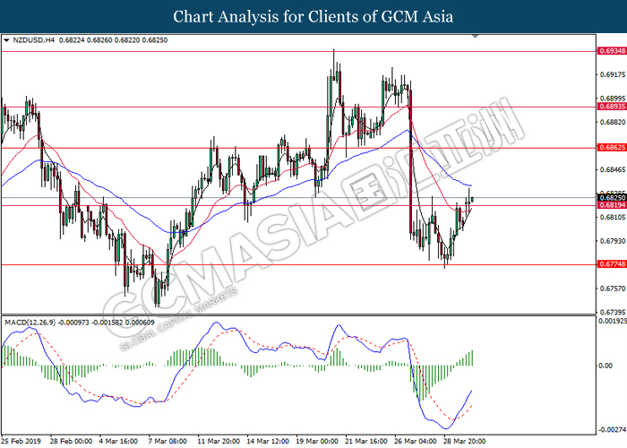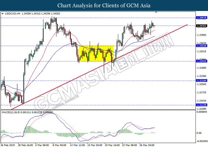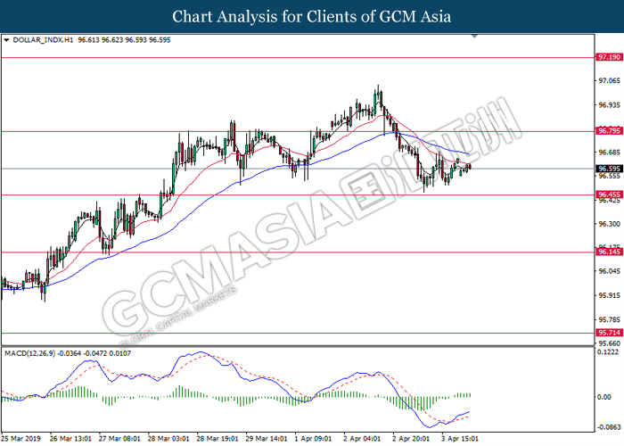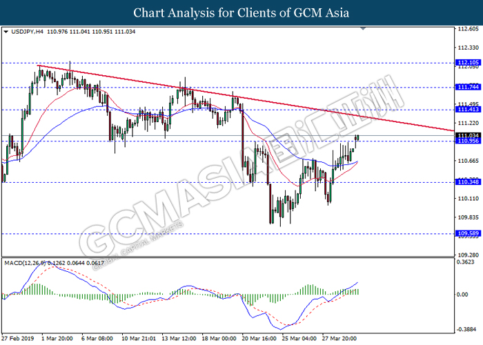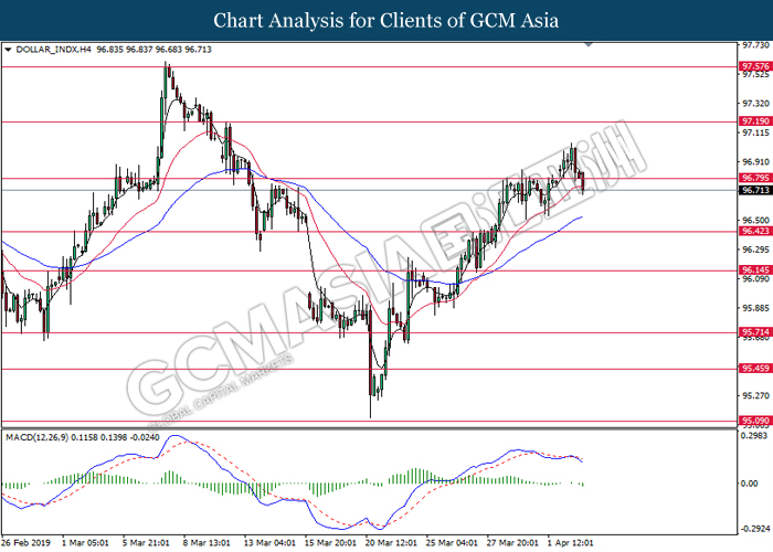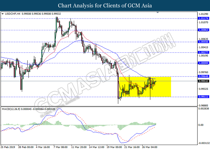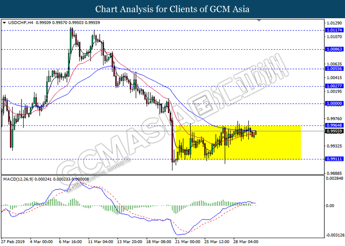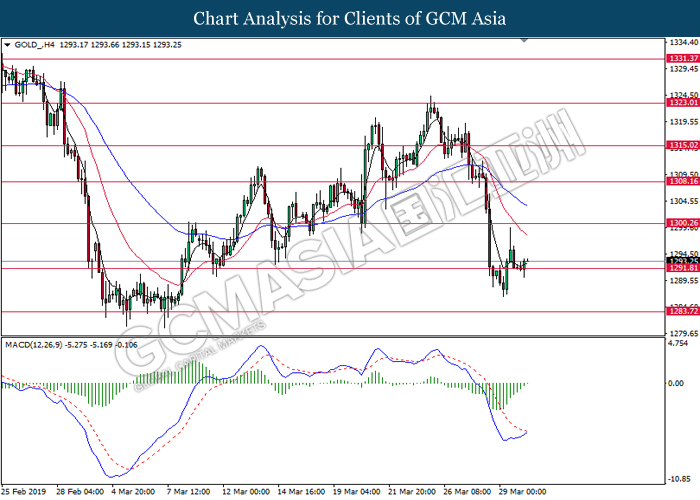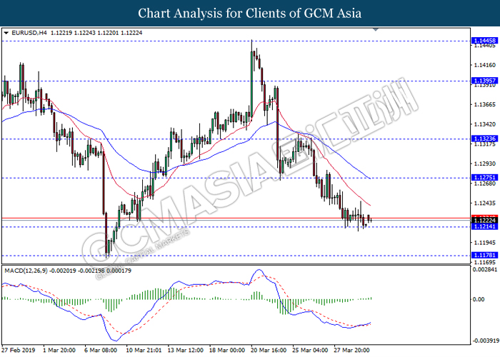 Dollar index measuring against a basket of six major currency pairs was traded lower by 0.03% to 96.76 at early Asian trading session after holding its grounds on Friday amid upbeat housing data and uncertainties arising from Brexit. During last Friday trading sessions, US New Home Sales data came in at 667K, beating economists’ expectations of 620K while indicating a higher housing sales activity as well as better economy outlook. Besides that, Friday’s announcement of higher than expected Michigan Consumer Sentiment with a reading of 98.4 against 97.8 also helped provide further support for the dollar. In other news, pair of GBP/USD fell by 0.10% to 1.3015 while remained pressured by Brexit deadlock. Prime Minister Theresa May faced a third-time defeat for the approval of her Brexit deal with the UK Parliament voting 388 against 286 during Last Friday’s Brexit vote. The UK is now under pressure of deciding whether to approve a Brexit deal before 12th April deadline, to crash out of the union without a deal or to request further delay to the Brexit deadline while remaining in the EU and participating in the next European Union general elections.