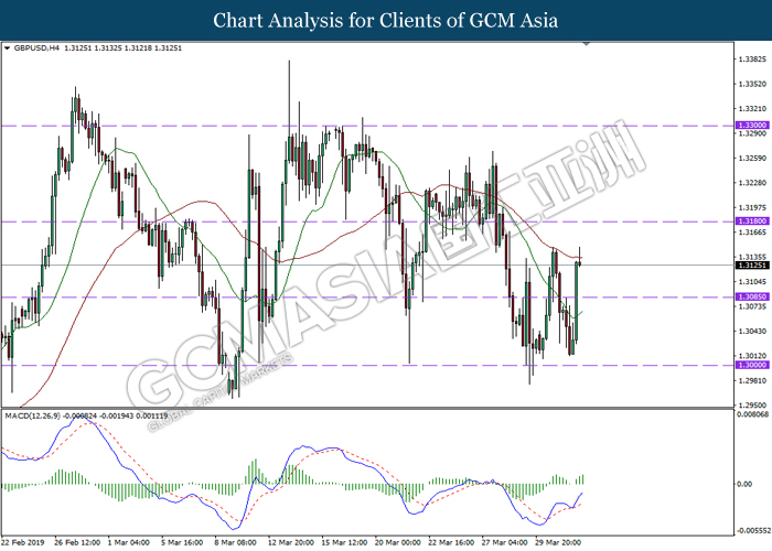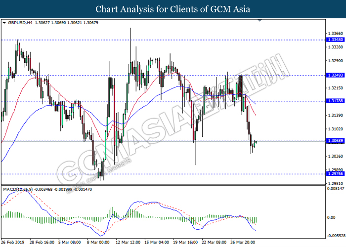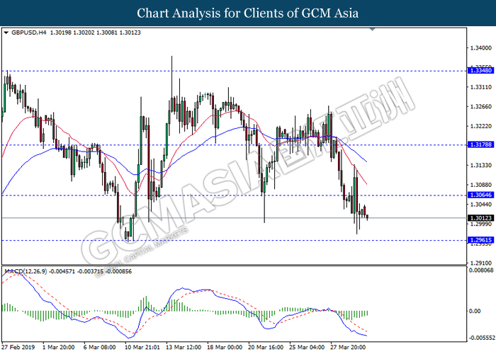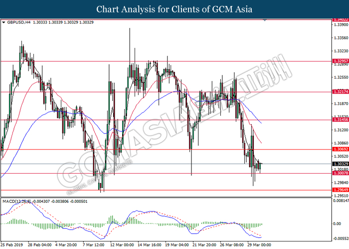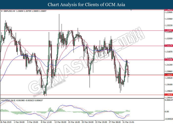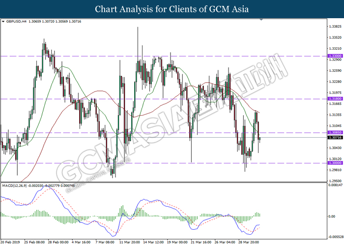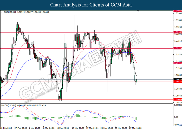 Greenback measuring against a basket of six major currency pairs was traded lower by 0.03% to 96.71 at early Asian trading session after breaking to its 2-week high despite poor data in the US. US GDP was growing slower at 2.2% as compared to its forecasted value of 2.4% while Pending Home Sales data came in at -1.0%, much lower compared to the forecasted reading of 0.1%. As recent dovish statement from Fed and economy outlook for the US are biased to signs of recession, the poor data did little changes to the market sentiment as market participants focus mainly on Brexit developments. As tension weighs on the pound market, investors are currently focusing on today’s key Brexit vote where a successful vote will allow the UK to leave the European Union by 22nd May. However, if UK parliament rejects Theresa May’s Brexit deal for the third time, UK will have to decide then whether to crash out of the EU without a deal on 12th April or request for a longer delay but remains in the EU while also participating in the next European Union general elections. Growing tensions in Brexit caused a large sell-off in the pound yesterday, however the pair of GBP/USD was able to pair part of its losses by 0.14% to 1.3060.