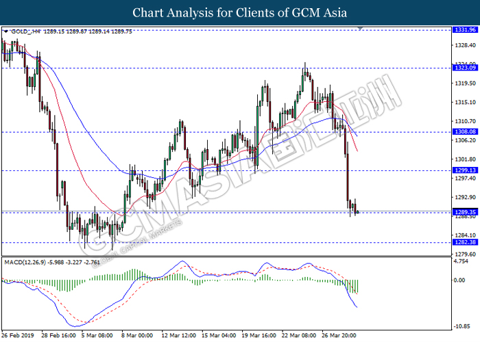 GOLD_, H4: Gold price was traded lower while currently testing the support level 1289.35. MACD which illustrate bearish bias signal suggest the commodity to extend its losses after it successfully breaks below the support level 1289.35.
