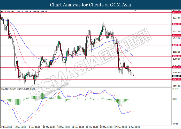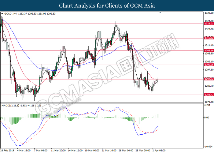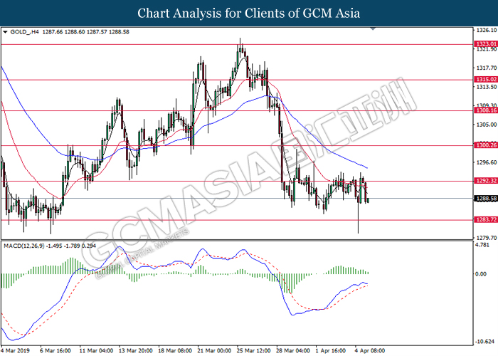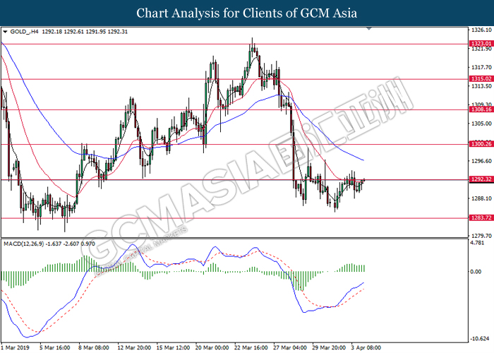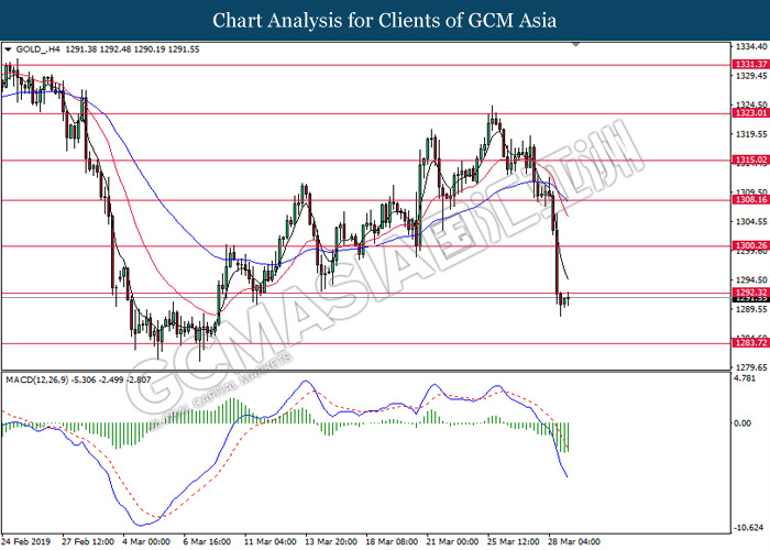 GOLD_, H4: Gold price was traded lower following prior breakout below the previous support level at 1292.30. MACD which illustrate bearish momentum suggest gold to extend its losses toward the support level at 1283.70.