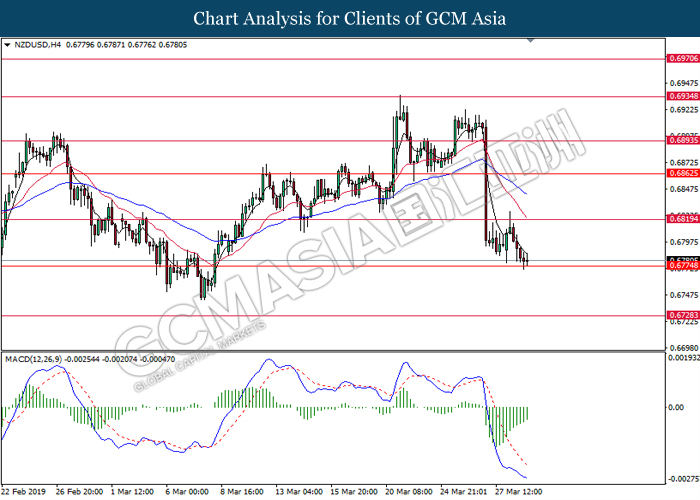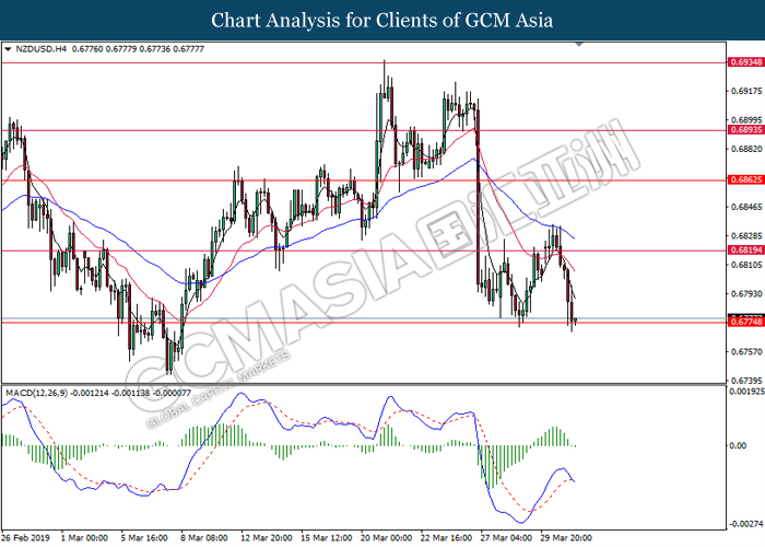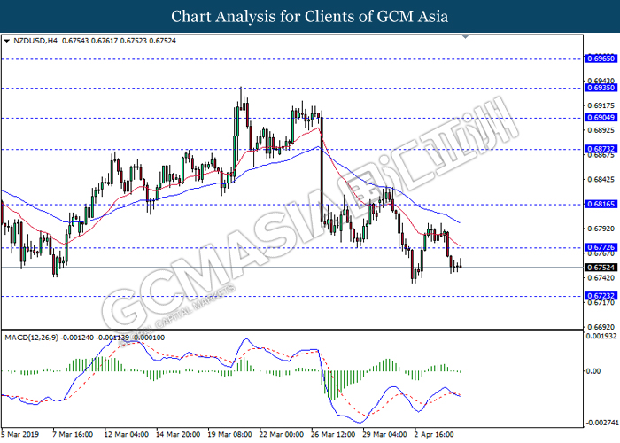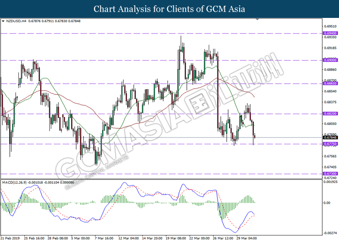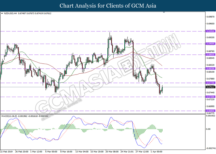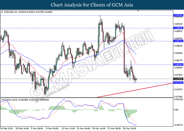 New Zealand dollar extended its losses since the start of Asian trading session following mixed signal delivered by Reserve Bank of New Zealand (RBNZ) Governor Adrian Orr. In an event hosted by the central bank, Orr stated that the bank is switching from neutral to easing bias following recessive risks in the market. Prior, RBNZ stunned the market after signaling to initiate a rate cut in the future rather than keeping it unchanged. RBNZ stated that they will remain focused upon inflation and employment objective while pursuing to maintain a stable inflationary level and financial market. Likewise, the currency received further bearish pressure after market participants flock to other assets as US and China restart their much-awaited trade negotiation which may bring volatility to the currency. In the US, greenback begins to retrace from its prior high levels following dovish outlook towards its economic progression. Thus far, US economic growth slowed down during the end of 2018, falling below Trump’s administration forecast. Such reading comes hand-in-hand with other major markets in the world which may brew higher concern towards global economic slowdown for the year 2019. As of writing, pair of NZD/USD depreciate by 0.10% to 0.6785 while the dollar index ticked down 0.01% to 96.72.
