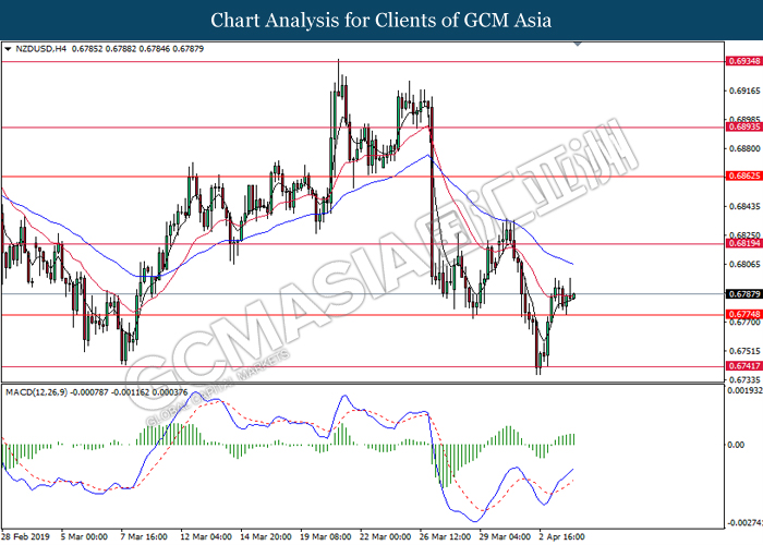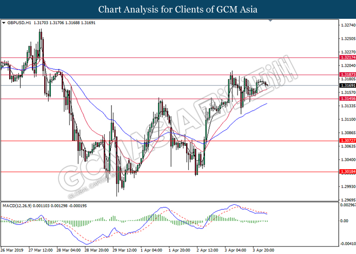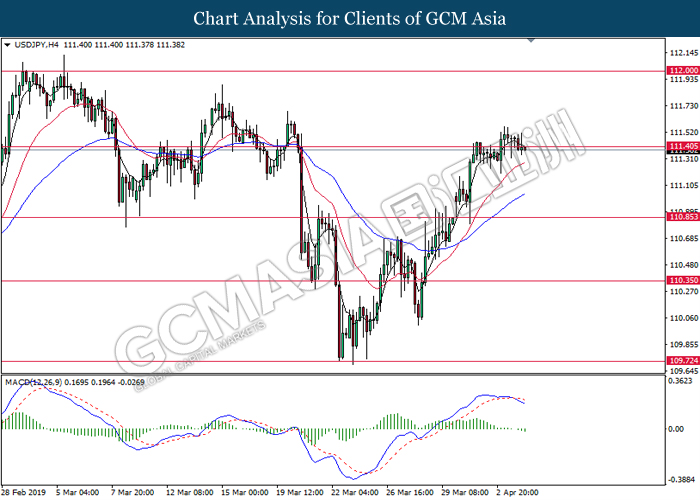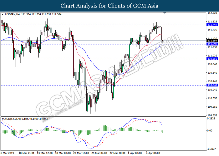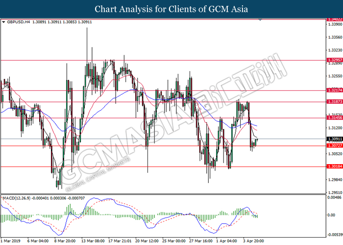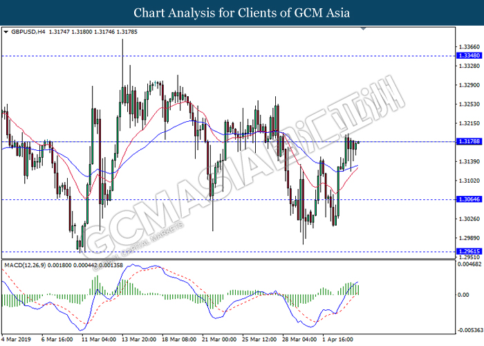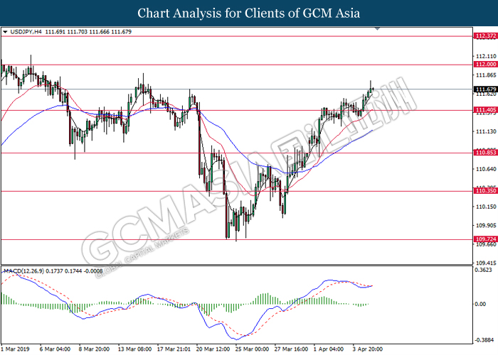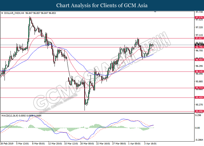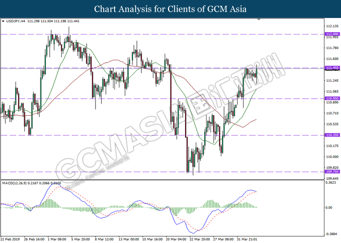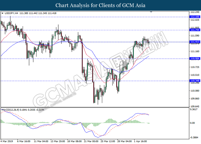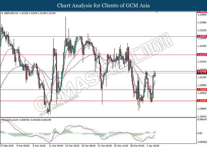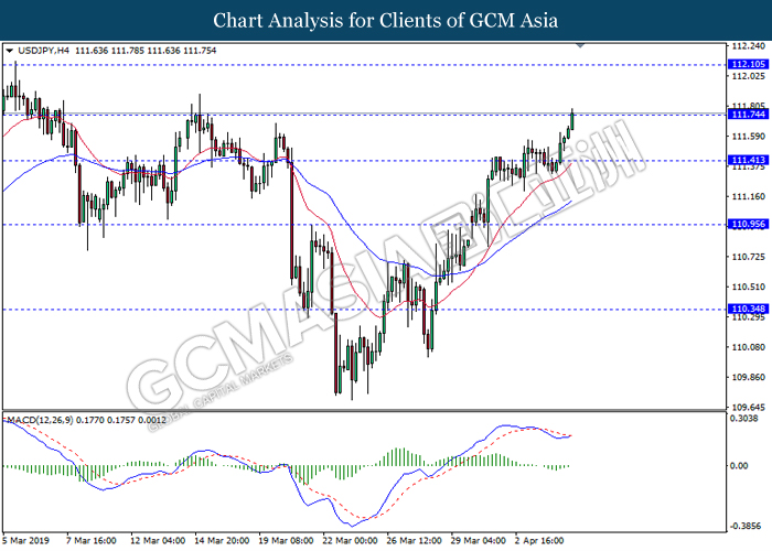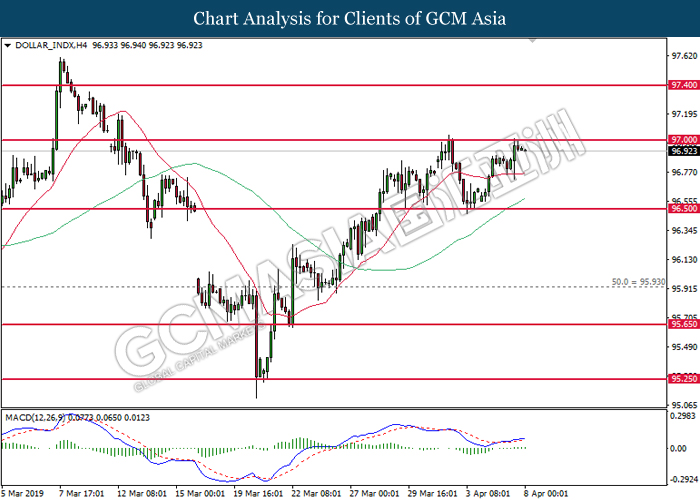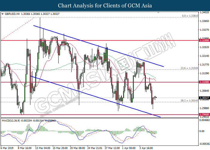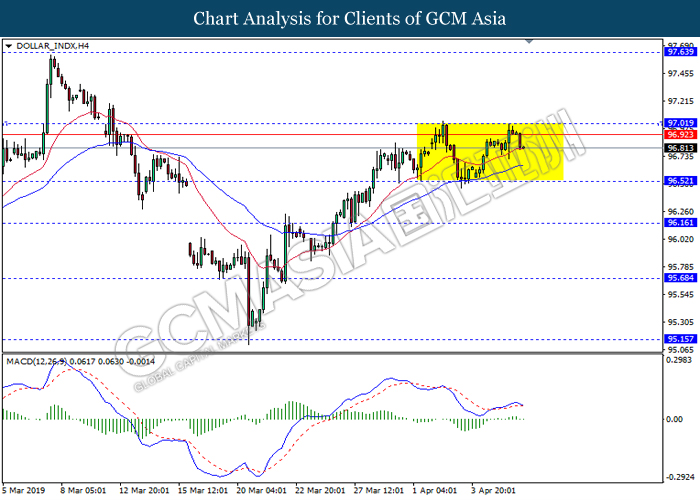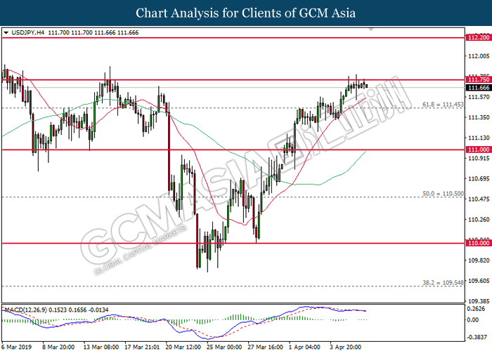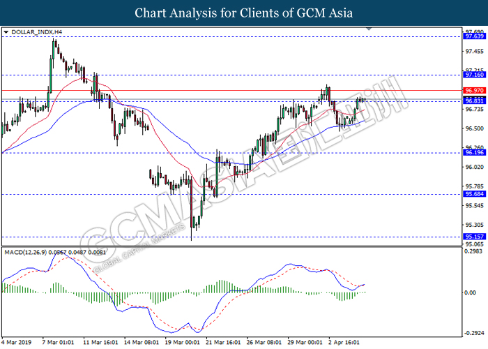 Dollar index managed to retain its gains following market sentiment which remains positive after last Friday release on U.S jobs report. The upbeat data on nonfarm payrolls which rose by a solid 196,000 in March have eased investors’ fear of a sharper slowdown in the world’s largest economy. At the same, U.S-Sino trade talk also provide positive news as both nations are inching closer to a trade deal following both powerhouses will be talking again this week via teleconferencing, according to reports. The greenback edge higher 0.06% to 96.95 as of writing. On the contrary, USD/JPY have fell 0.33% to 111.36 at the time of writing following upbeat data and geopolitical tension. Japan’s current account and trade balance data have surpassed forecast and prior, which in turn offered an initial short-covering to the Japanese Yen. Besides that, US Secretary of State Mike Pompeo urged Libyan National Army to stop its offensive on Tripoli highlighted the latest geopolitical tensions in Libya, adding further to the positive momentum for the Yen as market seeks for safe-haven currency such as Yen to evade risk.