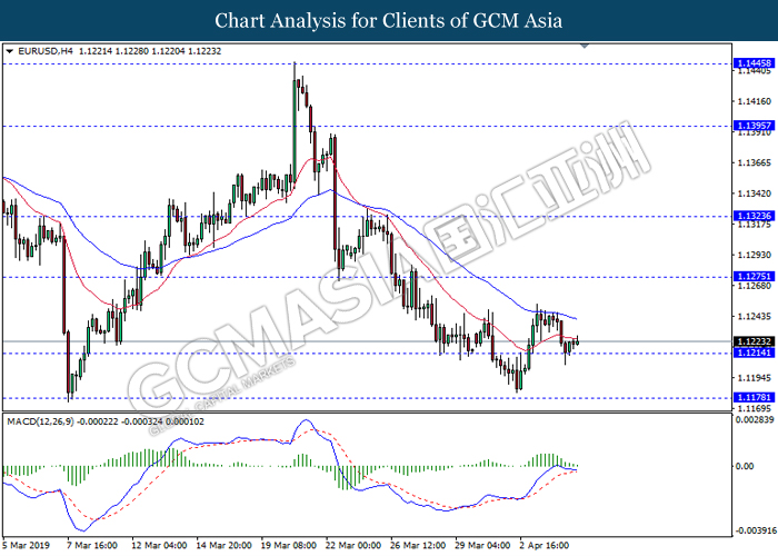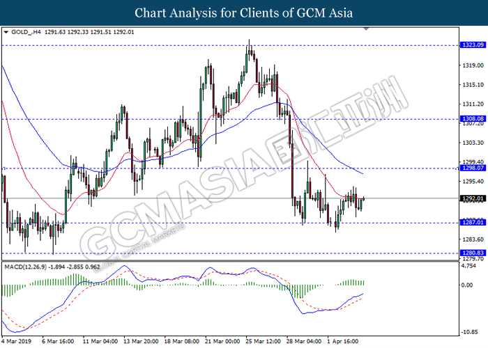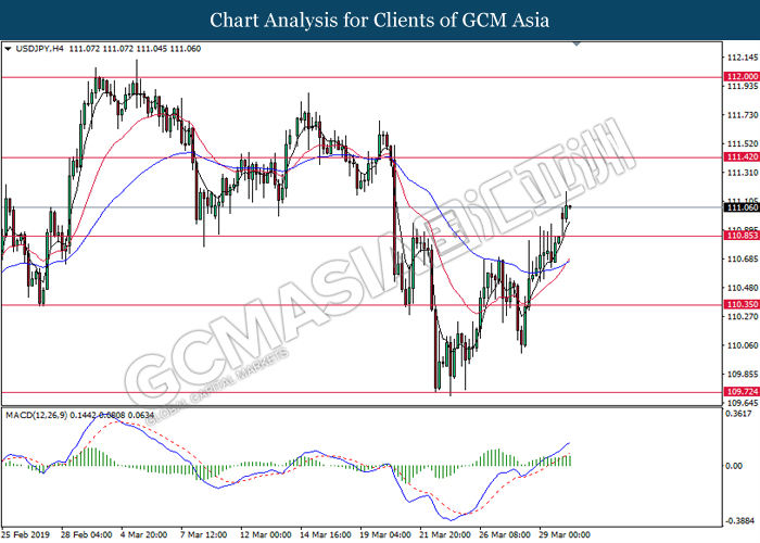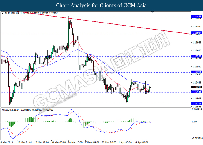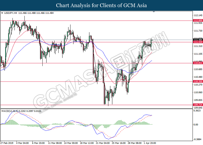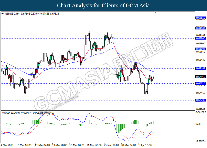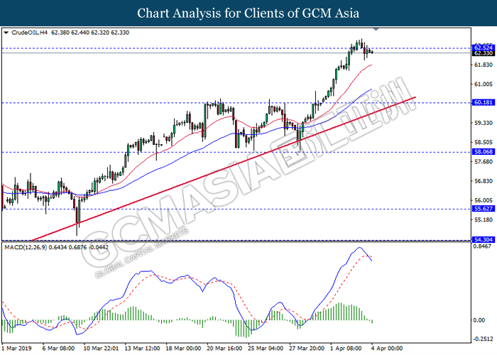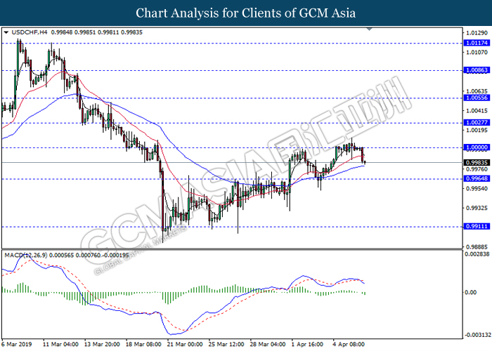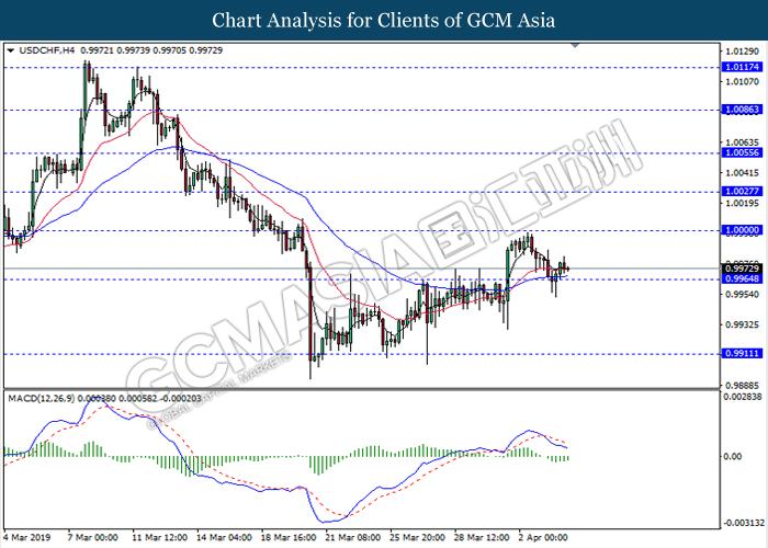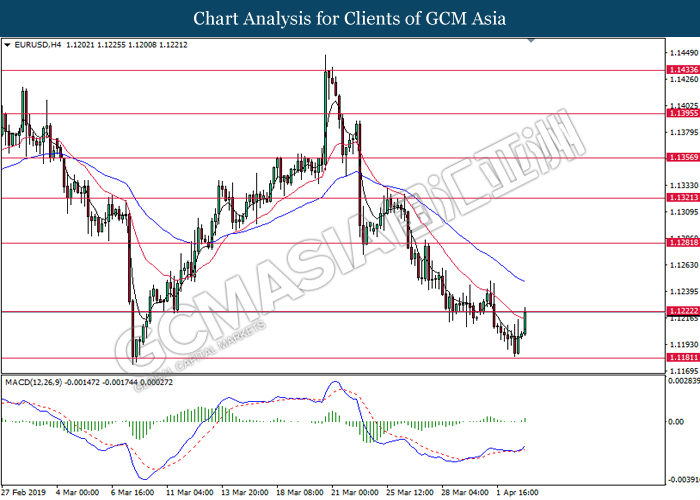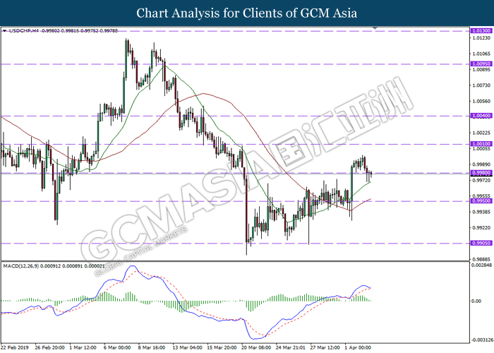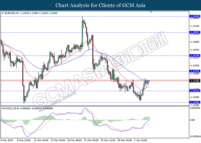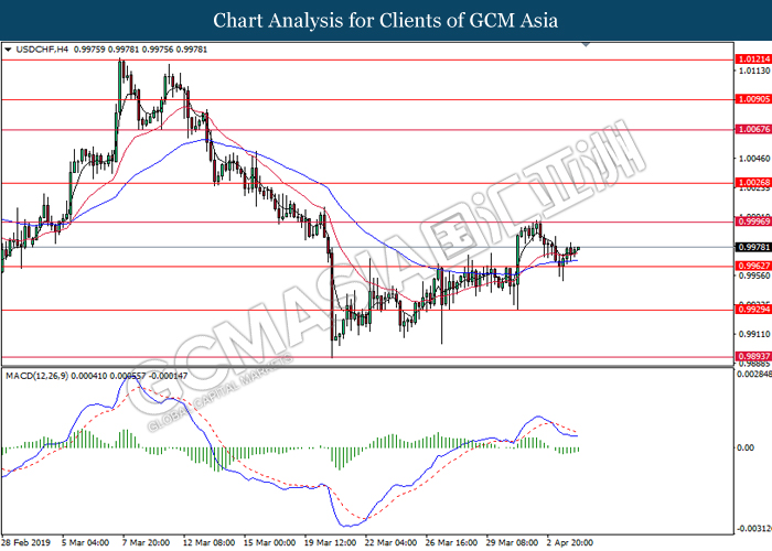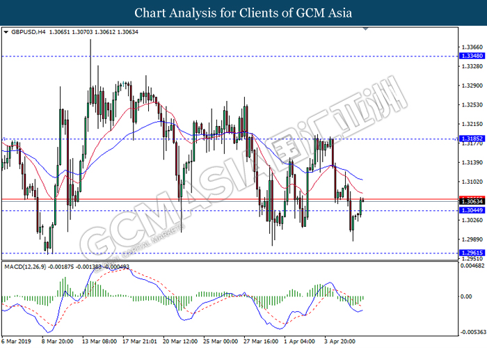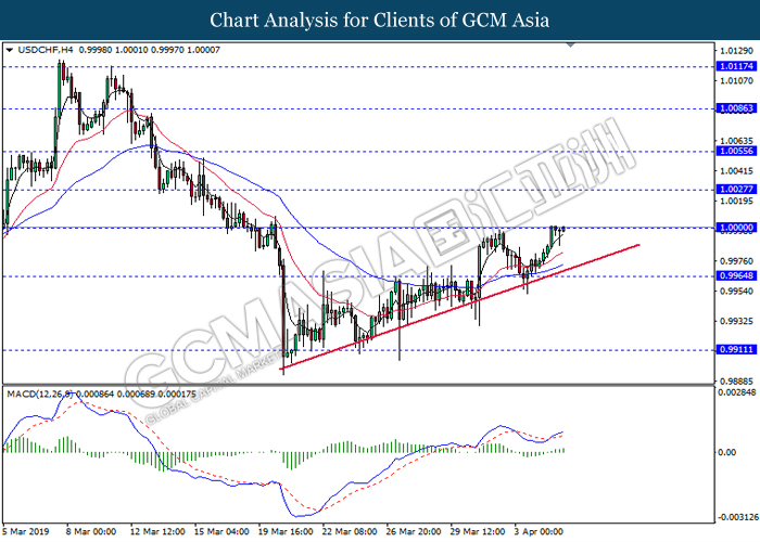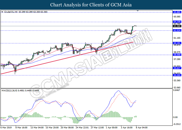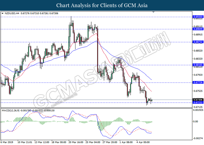 Dollar index managed to retain its gains following market sentiment which remains positive after last Friday release on U.S jobs report. The upbeat data on nonfarm payrolls which rose by a solid 196,000 in March have eased investors’ fear of a sharper slowdown in the world’s largest economy. At the same, U.S-Sino trade talk also provide positive news as both nations are inching closer to a trade deal following both powerhouses will be talking again this week via teleconferencing, according to reports. The greenback edge higher 0.06% to 96.95 as of writing. On the contrary, USD/JPY have fell 0.33% to 111.36 at the time of writing following upbeat data and geopolitical tension. Japan’s current account and trade balance data have surpassed forecast and prior, which in turn offered an initial short-covering to the Japanese Yen. Besides that, US Secretary of State Mike Pompeo urged Libyan National Army to stop its offensive on Tripoli highlighted the latest geopolitical tensions in Libya, adding further to the positive momentum for the Yen as market seeks for safe-haven currency such as Yen to evade risk.