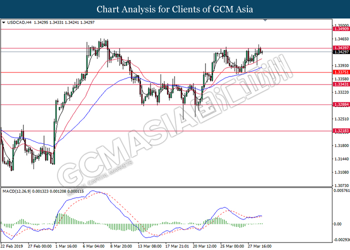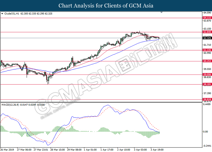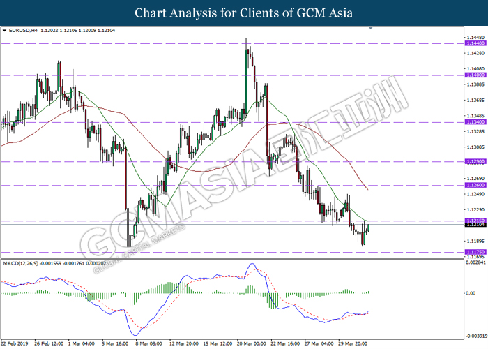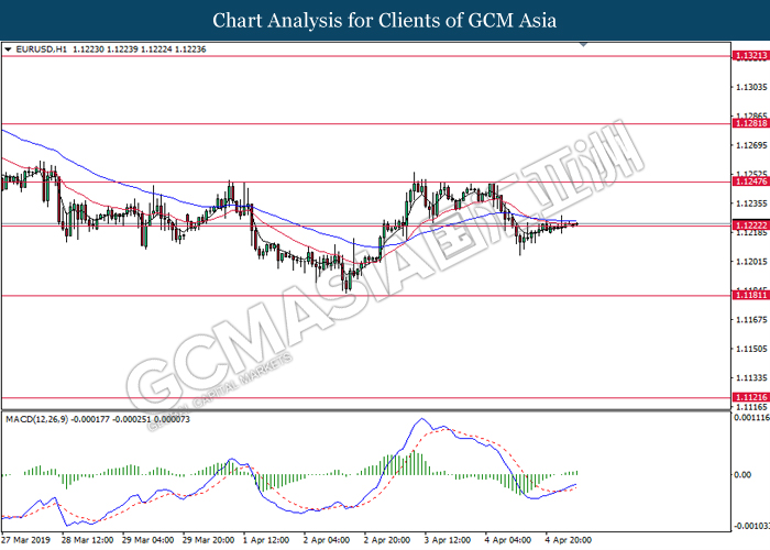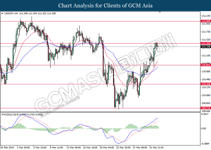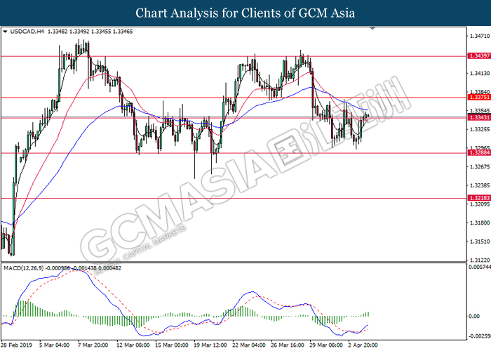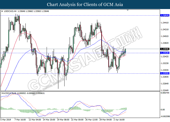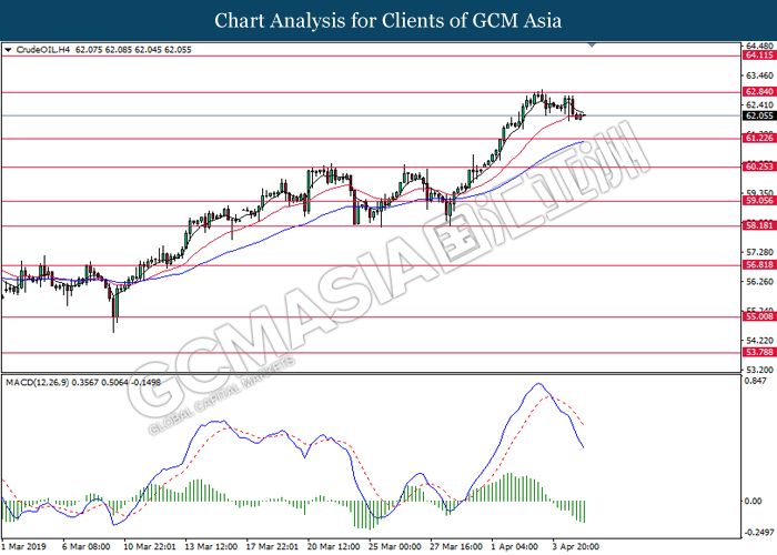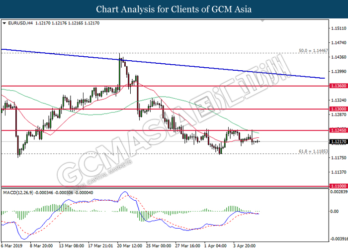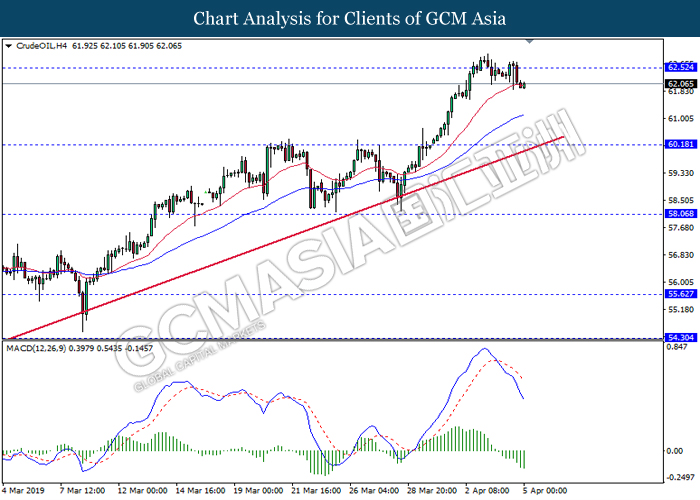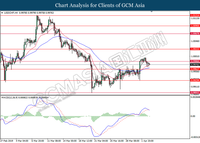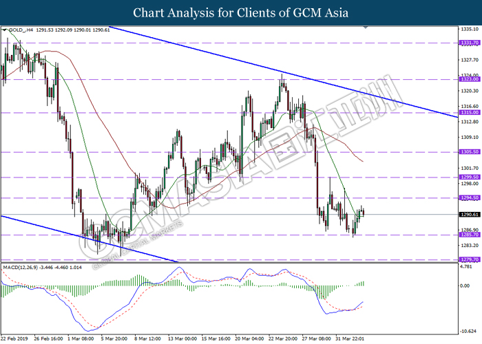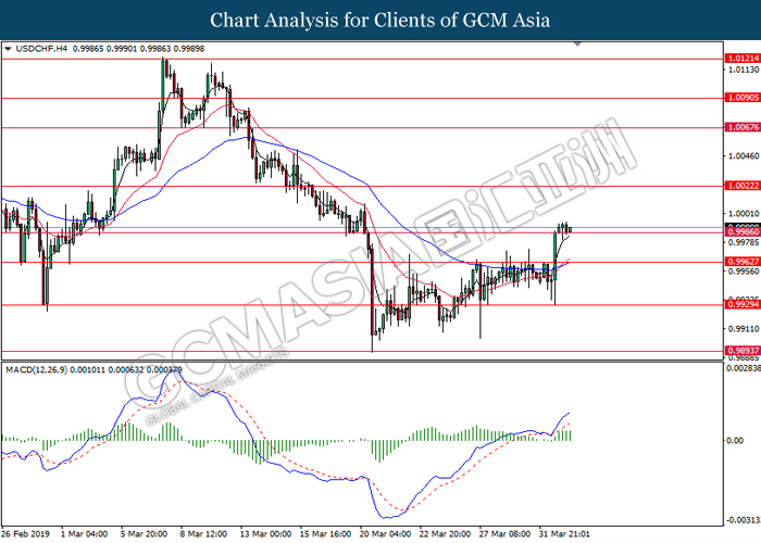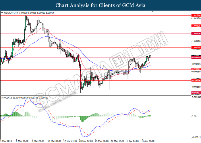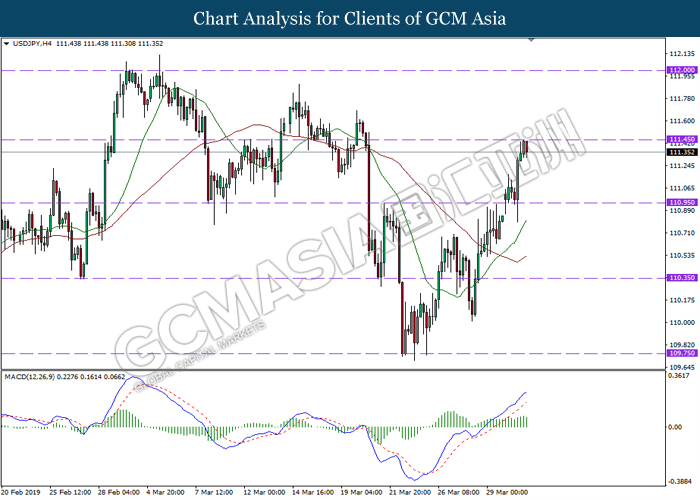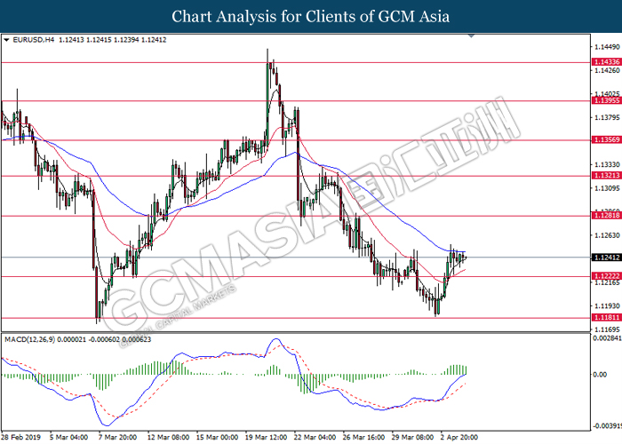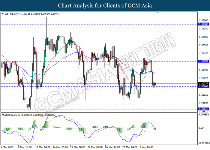 Dollar index managed to retain its gains following market sentiment which remains positive after last Friday release on U.S jobs report. The upbeat data on nonfarm payrolls which rose by a solid 196,000 in March have eased investors’ fear of a sharper slowdown in the world’s largest economy. At the same, U.S-Sino trade talk also provide positive news as both nations are inching closer to a trade deal following both powerhouses will be talking again this week via teleconferencing, according to reports. The greenback edge higher 0.06% to 96.95 as of writing. On the contrary, USD/JPY have fell 0.33% to 111.36 at the time of writing following upbeat data and geopolitical tension. Japan’s current account and trade balance data have surpassed forecast and prior, which in turn offered an initial short-covering to the Japanese Yen. Besides that, US Secretary of State Mike Pompeo urged Libyan National Army to stop its offensive on Tripoli highlighted the latest geopolitical tensions in Libya, adding further to the positive momentum for the Yen as market seeks for safe-haven currency such as Yen to evade risk.