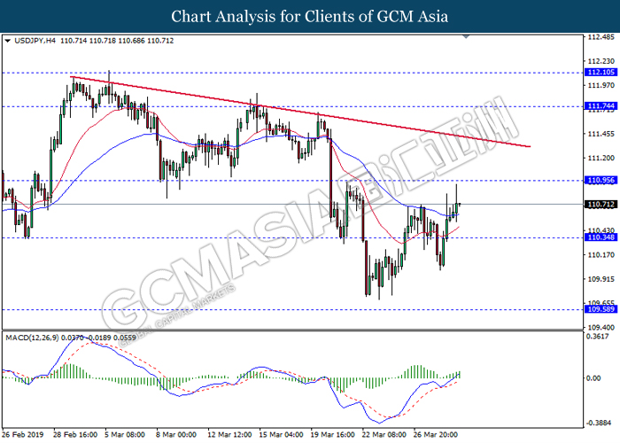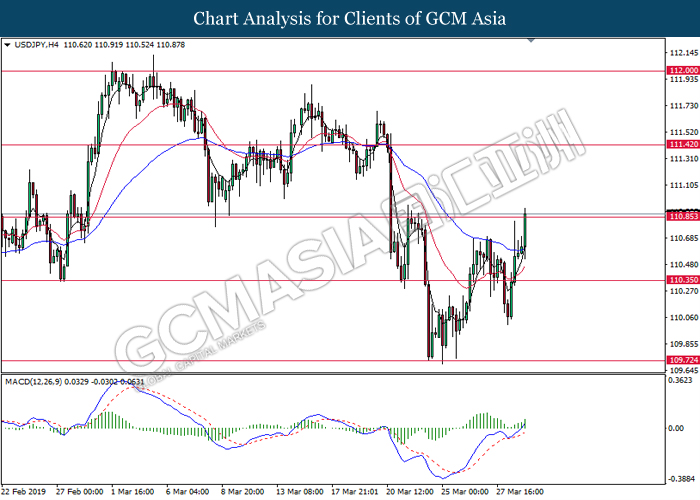 USDJPY, H4: USDJPY was traded higher while currently testing the resistance level at 110.85. MACD which display bullish signals suggest the pair to extend its gains after successfully breakout the resistance level 110.85.