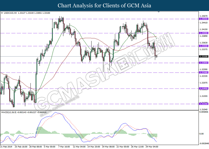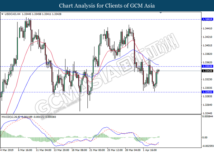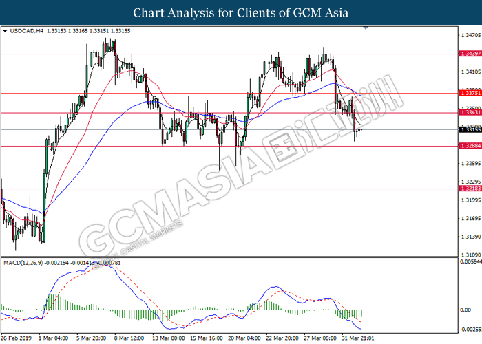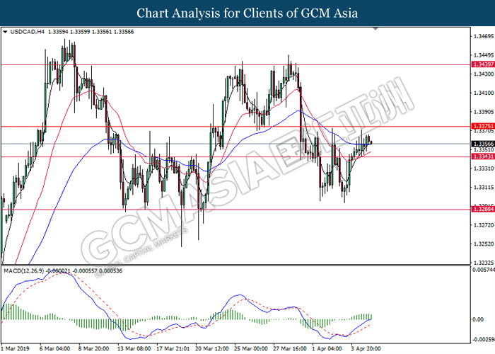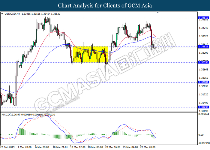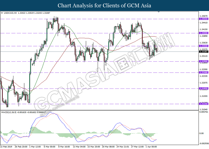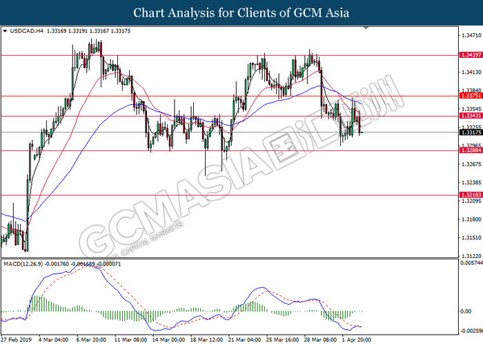 USDCAD, H4: USDCAD was traded lower following prior retracement from the resistance level at 1.3440. Due to lack of clear signal from MACD, it is suggested to wait until further signal appear before entering market.