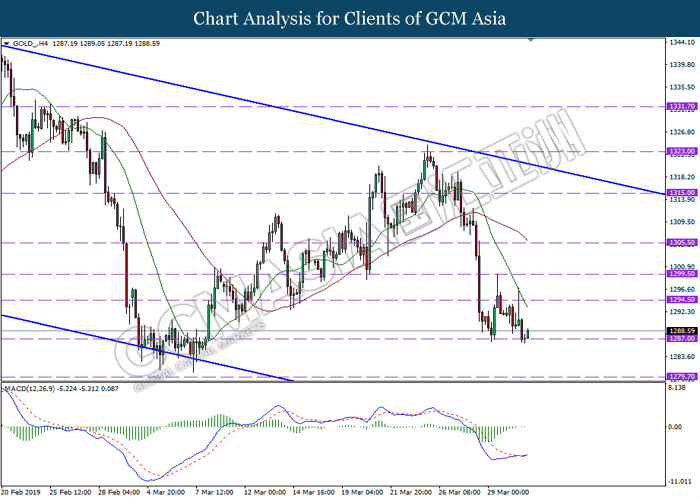 In the commodities market, crude oil price depreciates by 0.16% to $61.95 per barrel. Oil prices continues its bearish momentum as traders book their profits from prior uptrend. Otherwise, gold price slumped 0.35% to $1,287.80 a troy ounce following diminishing trade war risk between US and China.