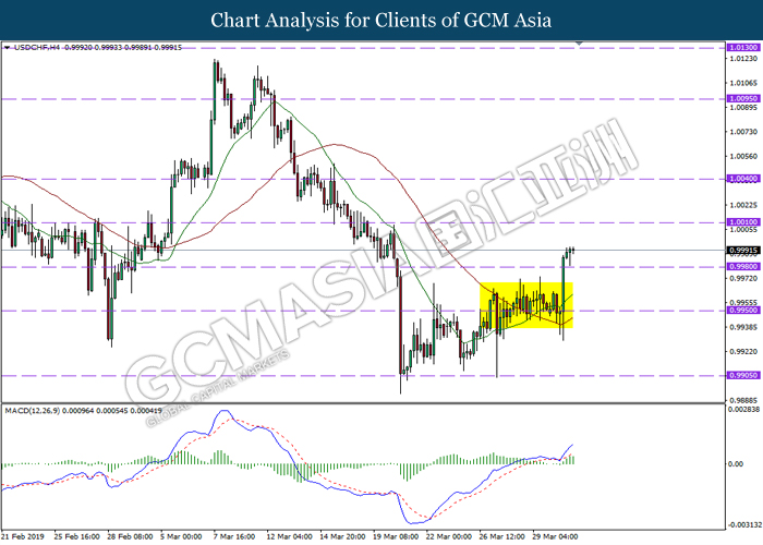 USDCHF, H4: USDCHF was traded flat near the support level of 0.9995. MACD which begins to form a death cross signal suggests the pair to experience technical correction following a successful closure below the support level of 0.9995.
