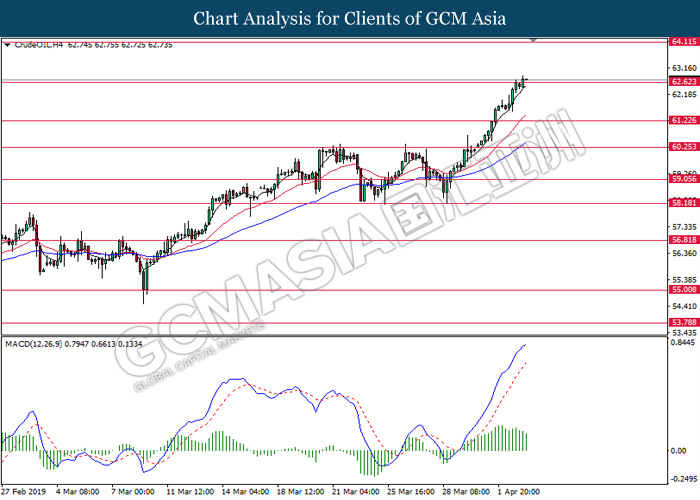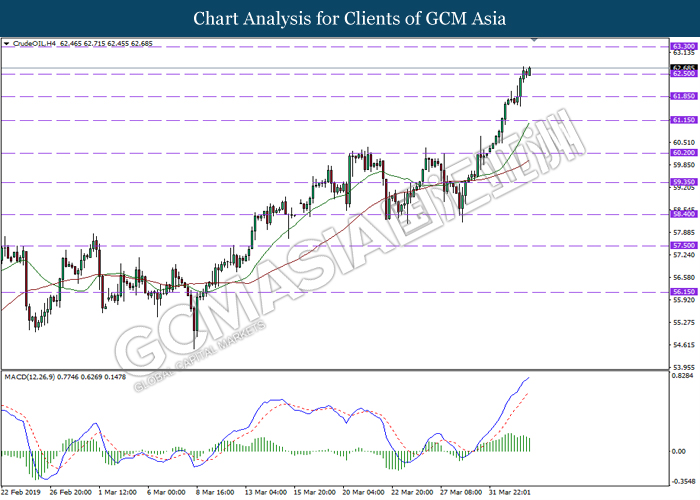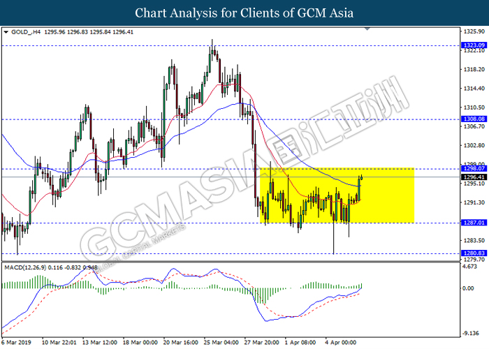 As for commodities, crude oil price surge 0.22% to $63.30 per barrel following ongoing optimism by OPEC supply cut with addition of Iran and Venezuela sanctions. Oil price rose to its highest since five month which currently continue to be driven by supply cuts which already last for 4 months in a row and various sanctions that reduce the supply even further. Besides that, geopolitical tensions in Libya also boosted further price as escalating conflict in OPEC producer Libya already raising supply concerns. On the other hand, gold price skyrocketed 0.37% to $1296.03 a troy ounce at the time of writing as the safe-haven metal was unfazed by strong U.S jobs report following China in demand for the yellow metal to increase their gold supply.