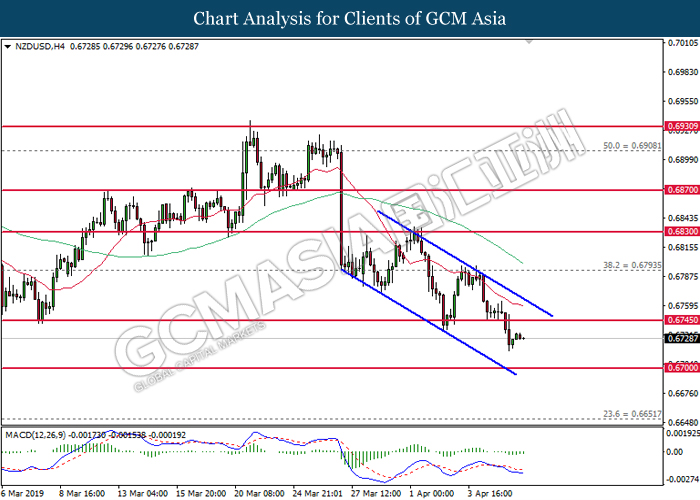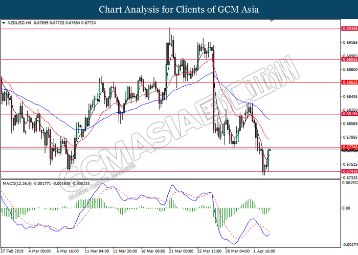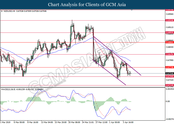 NZDUSD, H4: NZDUSD was traded lower following prior closure below 0.6745. MACD which illustrate bearish signal suggests the pair to advance further down, towards the direction of 0.6700.