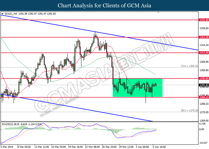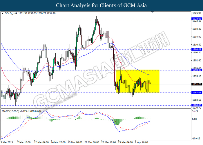 GOLD_, H4: Gold price remain traded in a sideway channel following recent rebound from the support level 1287.00. MACD which illustrate bullish momentum suggest the commodity to extend its rebound towards the resistance level 1298.05.