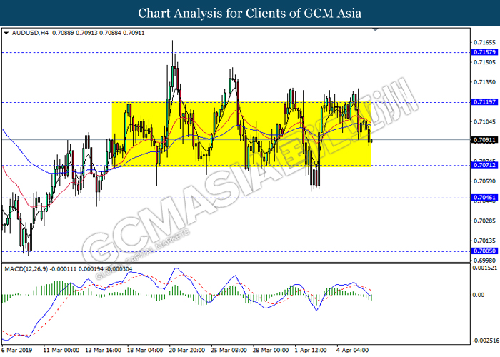 AUDUSD, H4: AUDUSD remain traded in a sideway channel following recent retracement from the resistance level 0.7120. MACD which display bearish momentum with the formation of death cross suggest the pair to extend its retracement towards the support level 0.7070.