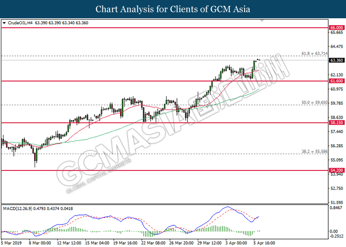 CrudeOIL, H4: Crude oil price was traded higher following prior rebound from the support near 61.60. MACD which has formed a golden cross signal suggests its prices to be traded higher in short-term after closing above 63.70.