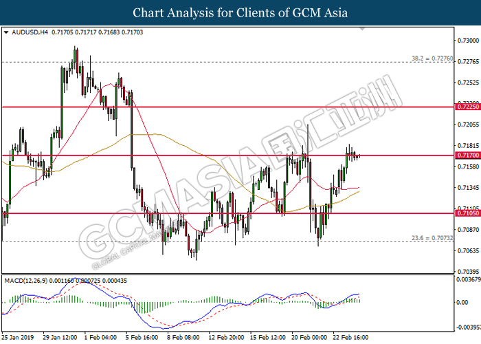 AUDUSD, H4: AUDUSD was traded higher while currently testing at the resistance of 0.7170. MACD which illustrate bullish signal suggests the pair to advance further upwards after successfully closing above this resistance level.