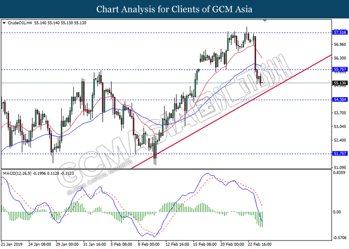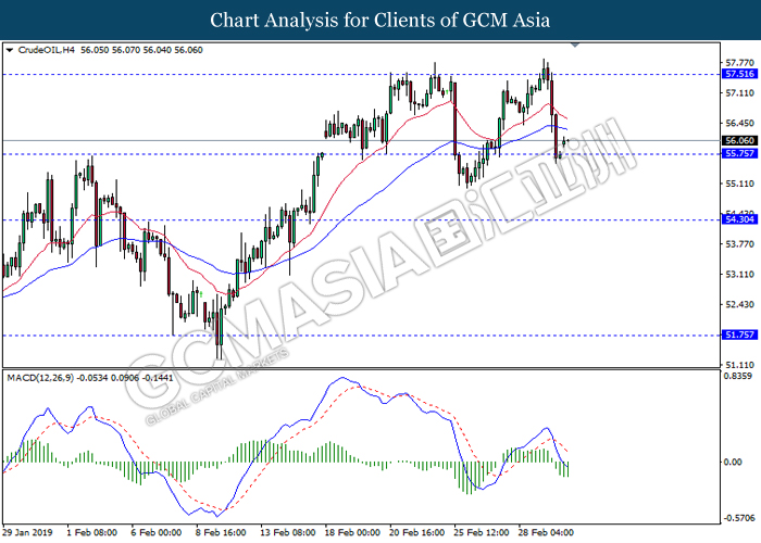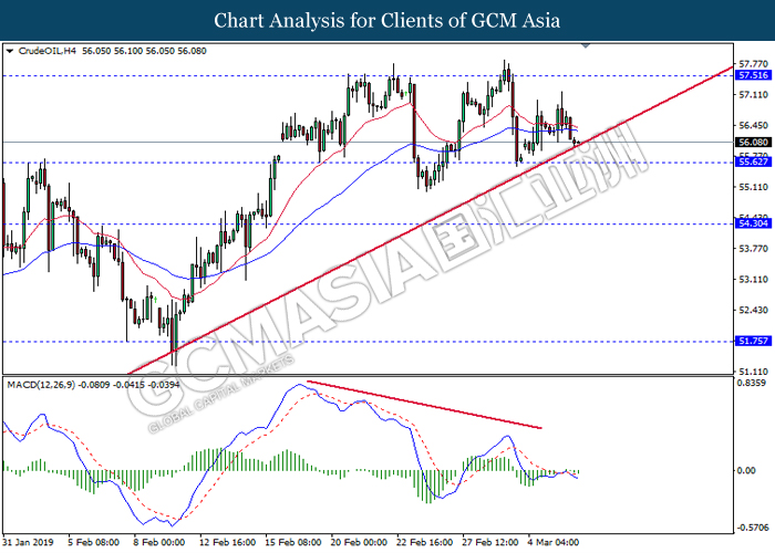 CrudeOIL, H4: Crude oil price was traded lower while currently testing the upwards trend line. MACD which illustrate bearish momentum suggest the commodity to extend its losses after breaking below the upward trend line and the support level at 55.60.