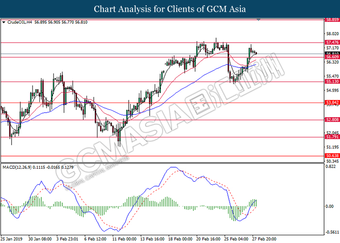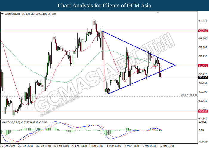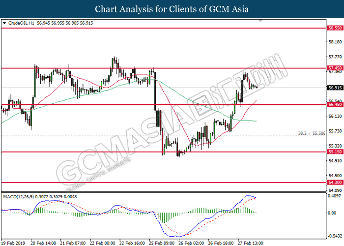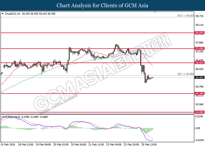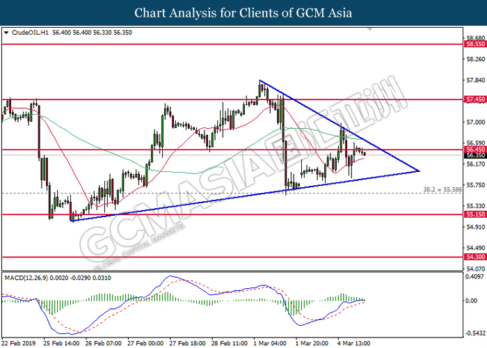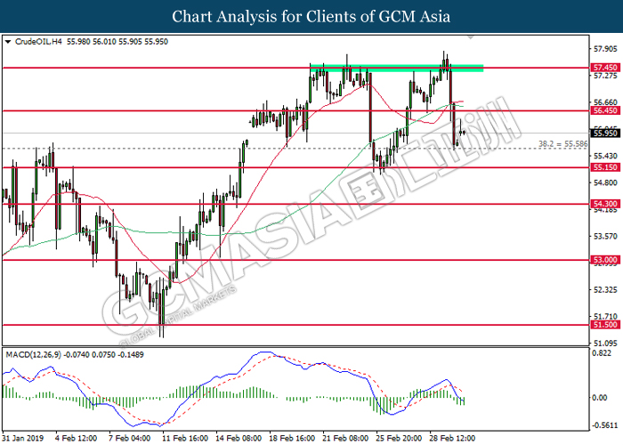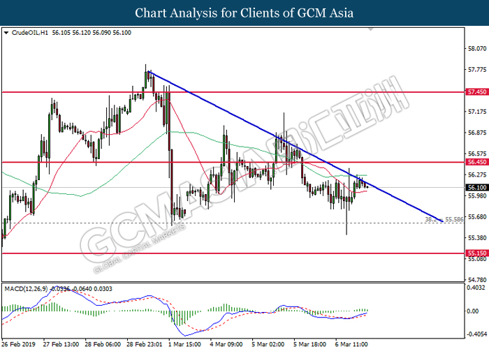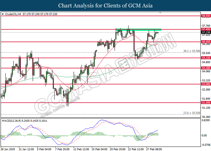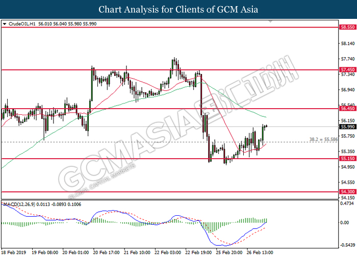 CrudeOIL, H1: Crude oil price was traded higher following prior rebound from the support of 55.15. MACD which illustrate bullish signal suggests its prices to extend its gains, towards the direction of 56.45.