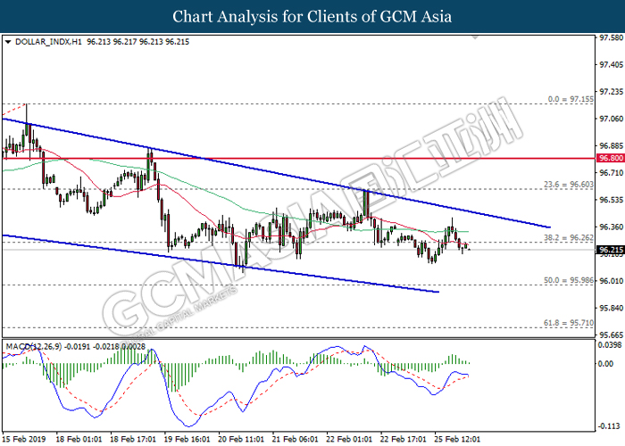 DOLLAR_INDX, H1: Dollar index was traded lower following prior close below 96.25. MACD which illustrate diminished upward momentum suggests the index to be traded lower in short-term, towards the lower level of the descending channel.