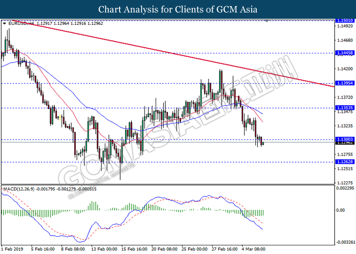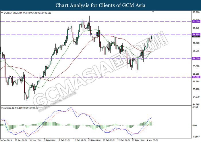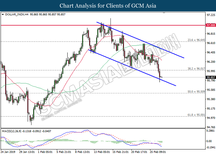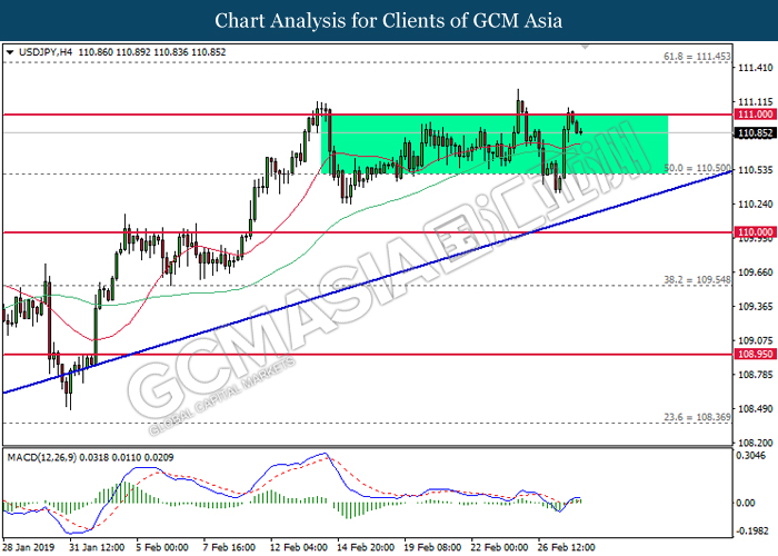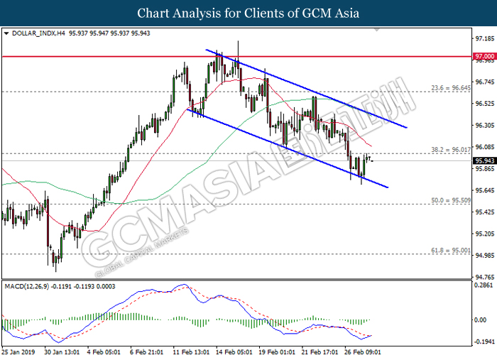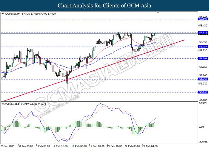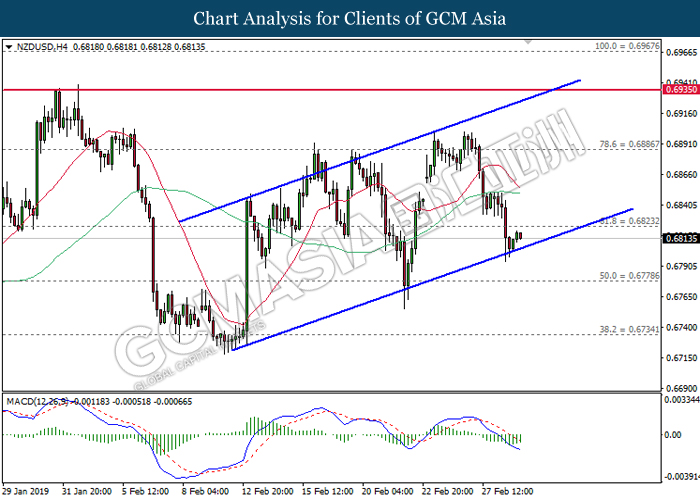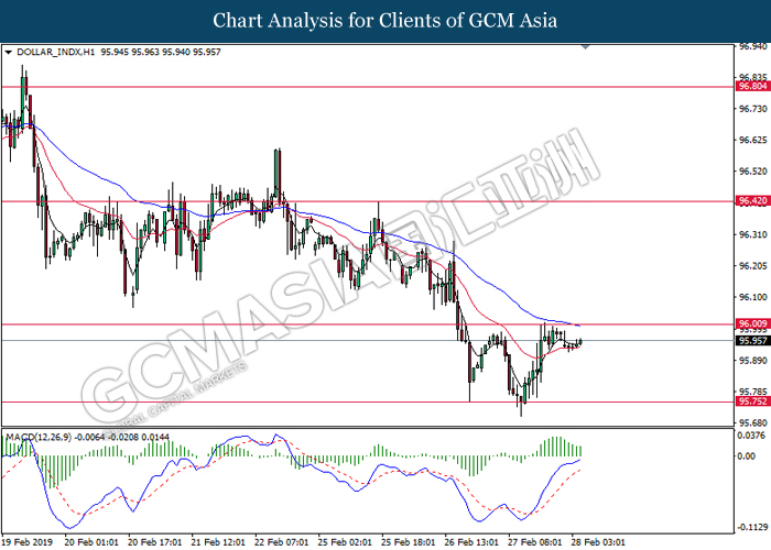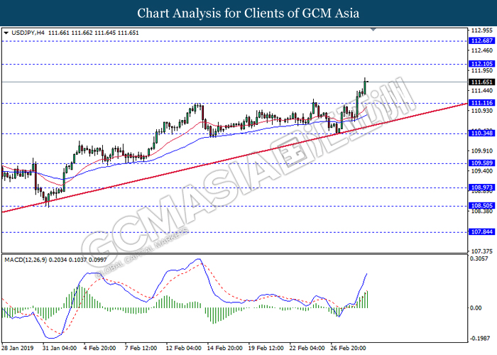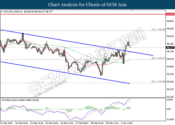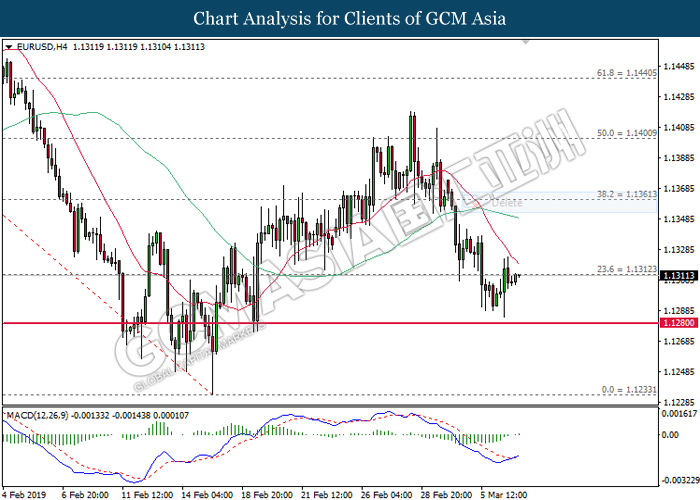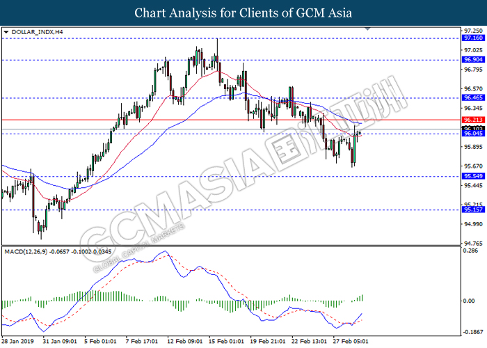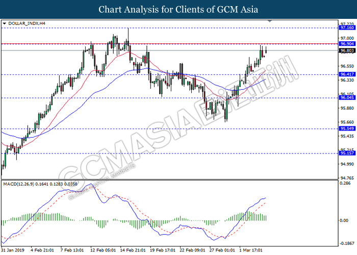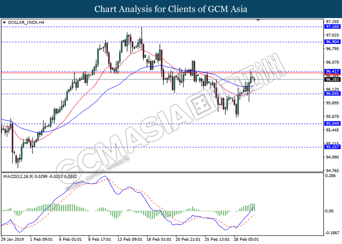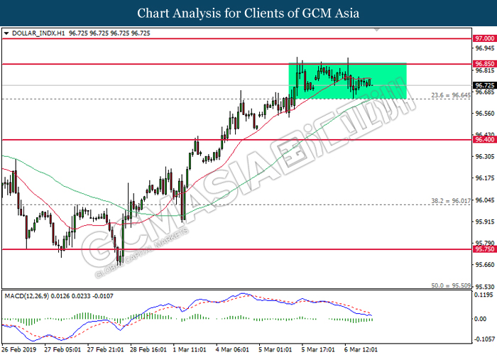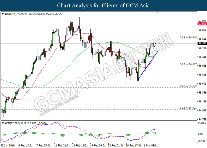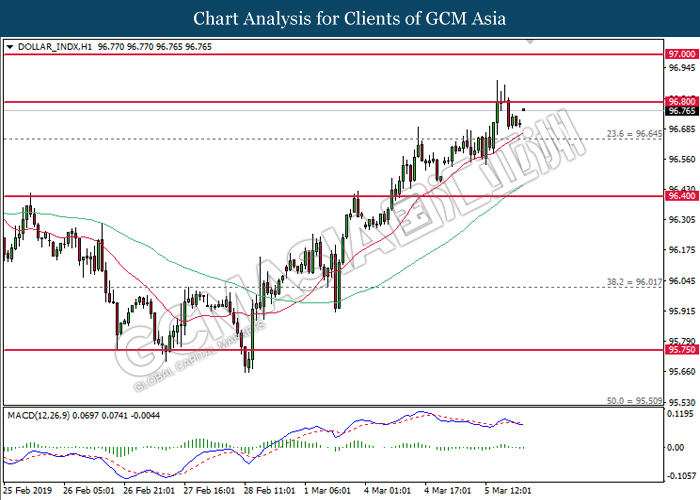 Dollar index hovered near weakest point in one week after FOMC Member Clarida has given out dovish tilt tone on the current economy outlook. According to his speech on yesterday, he emphasized that a pause on tightening policy decision was a brilliant move as the current economy is running close to full employment and inflation level is getting near to the Federal Reserve target. In order to remain economy resiliency, Fed policymakers have showed that they are in favor to be patient where ‘freezing’ the lending rate at ‘neutral’ before continue their tightening plan. As of now, investor keep their eyes on Fed Chairman Powell Testifies before entering into the market as testifies on economy outlook and recent monetary policy action will determine the future trends of Greenback. Dollar index inched down 0.05% to 96.35 during Asian trading session. On the other hand, the pair of GBP/USD surged 0.32% to 1.3135 after Theresa May said she is considering to a plan to further extend the Brexit deadline and avoid U.K. leaving the European Union with no deal next month. With an extension on deadline, there would be more sufficient time to negotiate between U.K. and EU on Brexit unsolved issue especially the backstop of Northern Ireland.