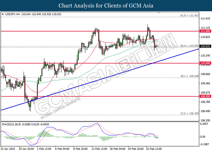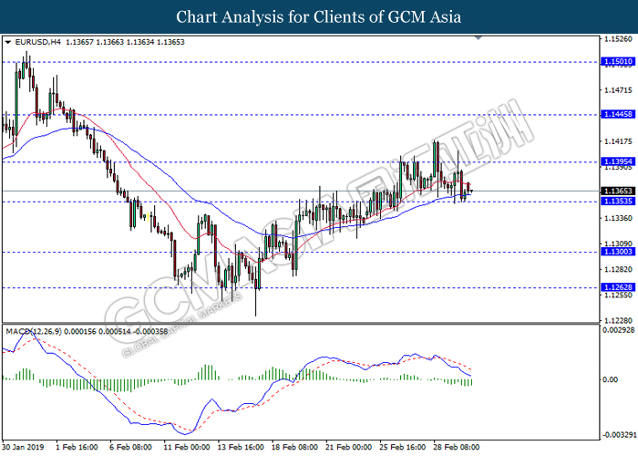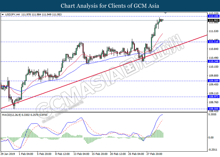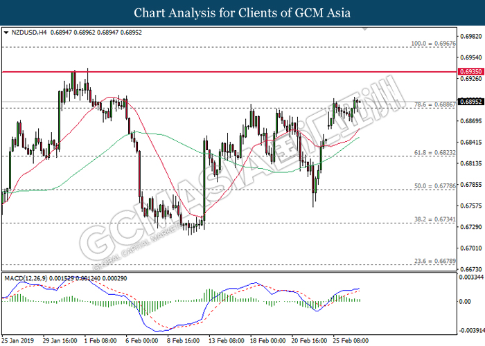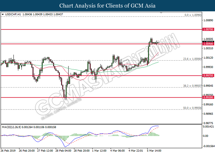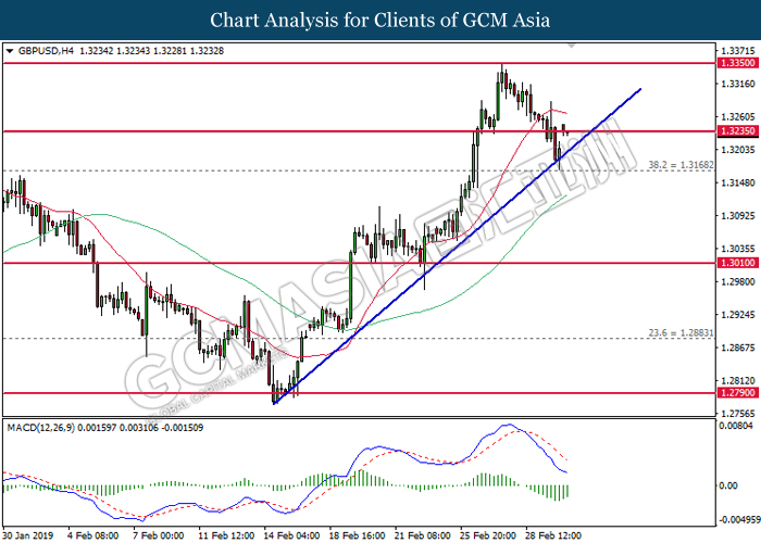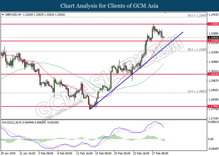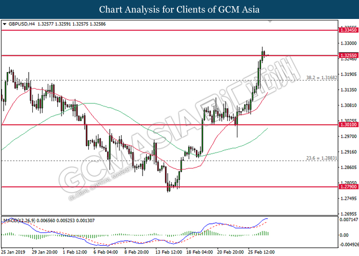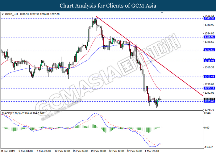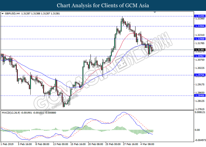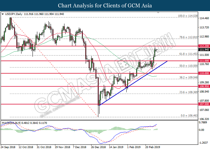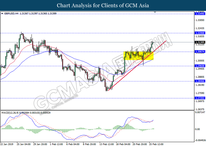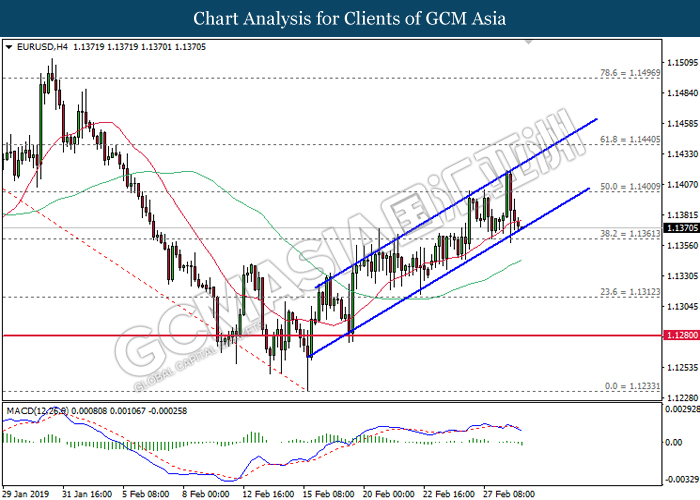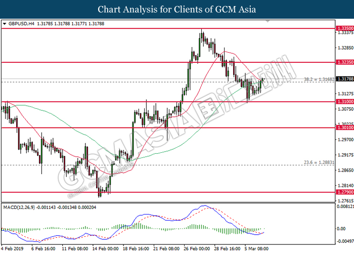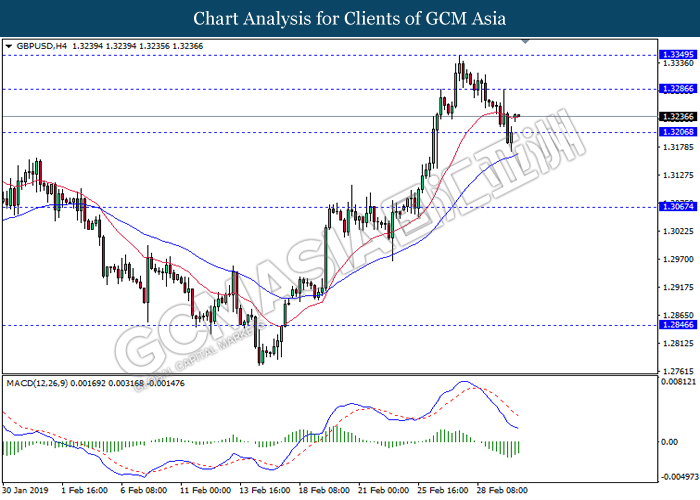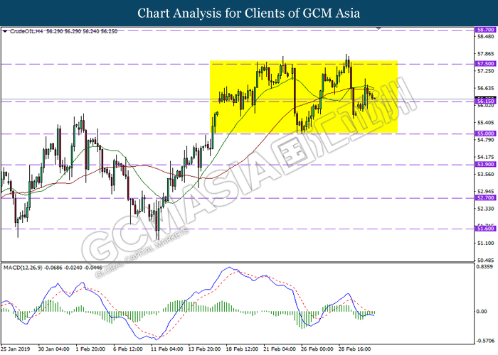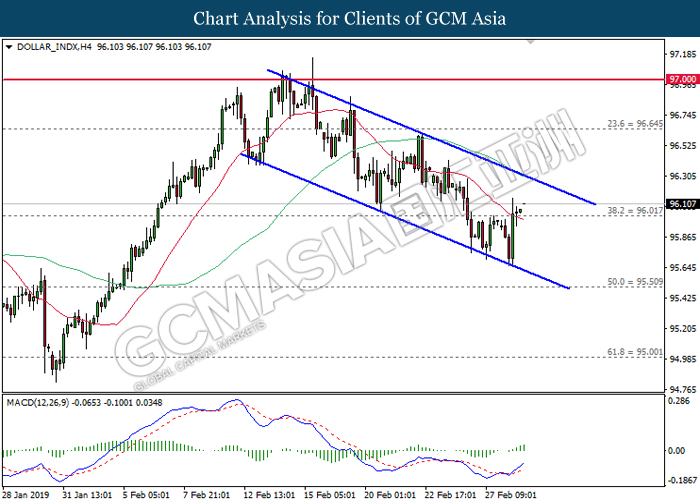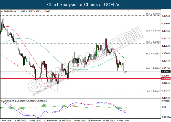 Dollar index hovered near weakest point in one week after FOMC Member Clarida has given out dovish tilt tone on the current economy outlook. According to his speech on yesterday, he emphasized that a pause on tightening policy decision was a brilliant move as the current economy is running close to full employment and inflation level is getting near to the Federal Reserve target. In order to remain economy resiliency, Fed policymakers have showed that they are in favor to be patient where ‘freezing’ the lending rate at ‘neutral’ before continue their tightening plan. As of now, investor keep their eyes on Fed Chairman Powell Testifies before entering into the market as testifies on economy outlook and recent monetary policy action will determine the future trends of Greenback. Dollar index inched down 0.05% to 96.35 during Asian trading session. On the other hand, the pair of GBP/USD surged 0.32% to 1.3135 after Theresa May said she is considering to a plan to further extend the Brexit deadline and avoid U.K. leaving the European Union with no deal next month. With an extension on deadline, there would be more sufficient time to negotiate between U.K. and EU on Brexit unsolved issue especially the backstop of Northern Ireland.