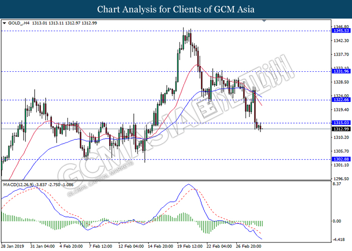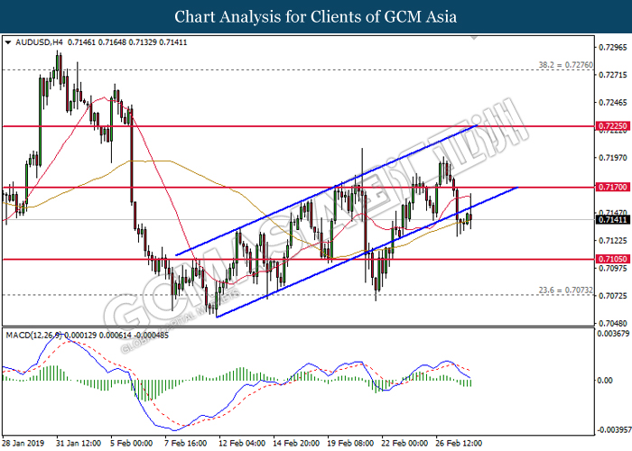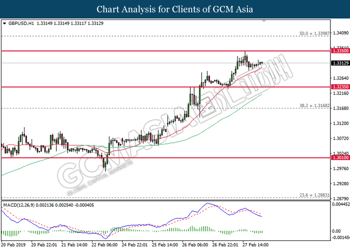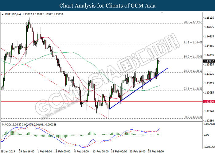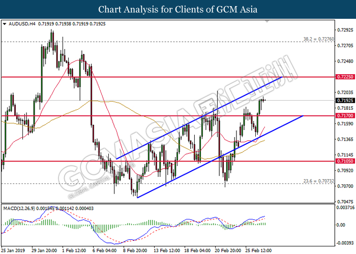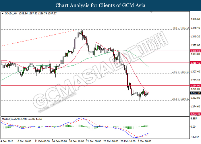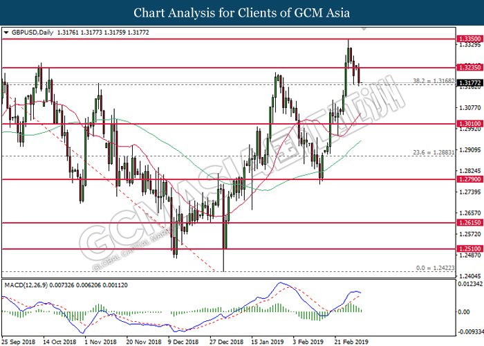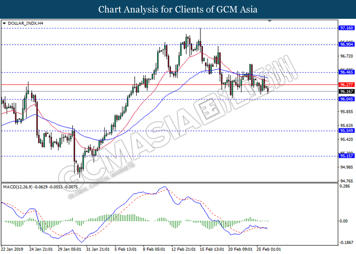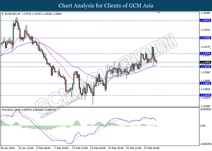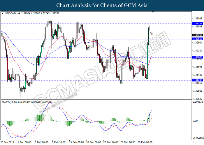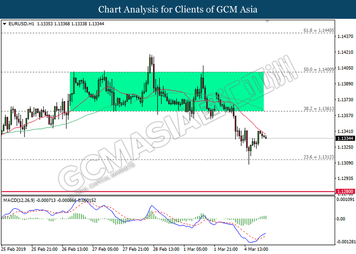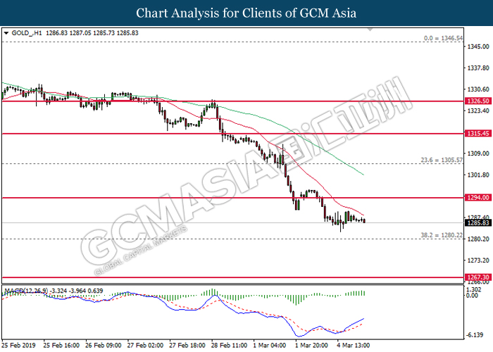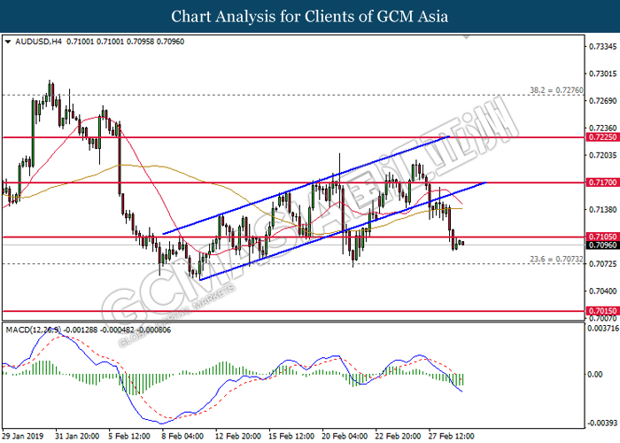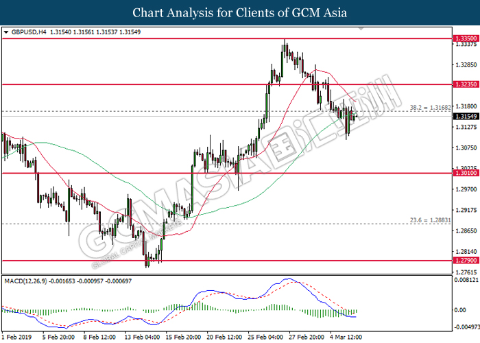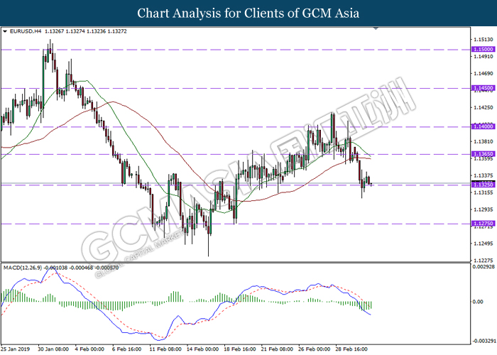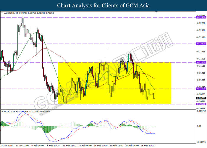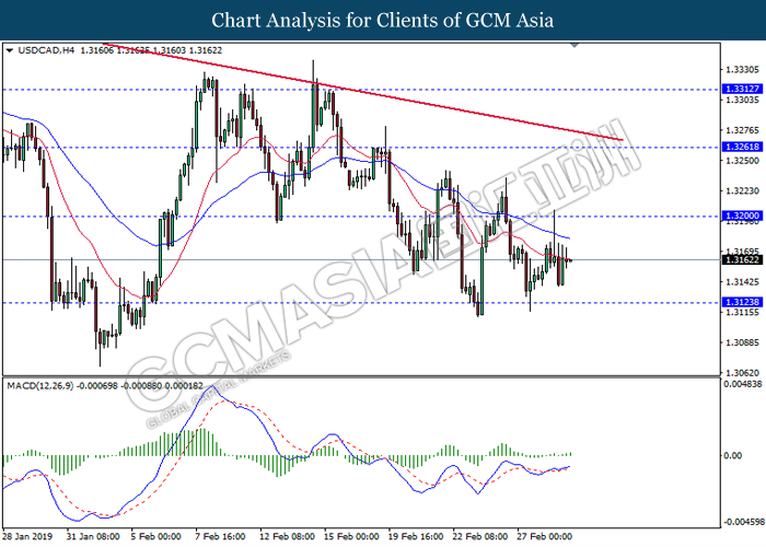 Dollar index hovered near weakest point in one week after FOMC Member Clarida has given out dovish tilt tone on the current economy outlook. According to his speech on yesterday, he emphasized that a pause on tightening policy decision was a brilliant move as the current economy is running close to full employment and inflation level is getting near to the Federal Reserve target. In order to remain economy resiliency, Fed policymakers have showed that they are in favor to be patient where ‘freezing’ the lending rate at ‘neutral’ before continue their tightening plan. As of now, investor keep their eyes on Fed Chairman Powell Testifies before entering into the market as testifies on economy outlook and recent monetary policy action will determine the future trends of Greenback. Dollar index inched down 0.05% to 96.35 during Asian trading session. On the other hand, the pair of GBP/USD surged 0.32% to 1.3135 after Theresa May said she is considering to a plan to further extend the Brexit deadline and avoid U.K. leaving the European Union with no deal next month. With an extension on deadline, there would be more sufficient time to negotiate between U.K. and EU on Brexit unsolved issue especially the backstop of Northern Ireland.