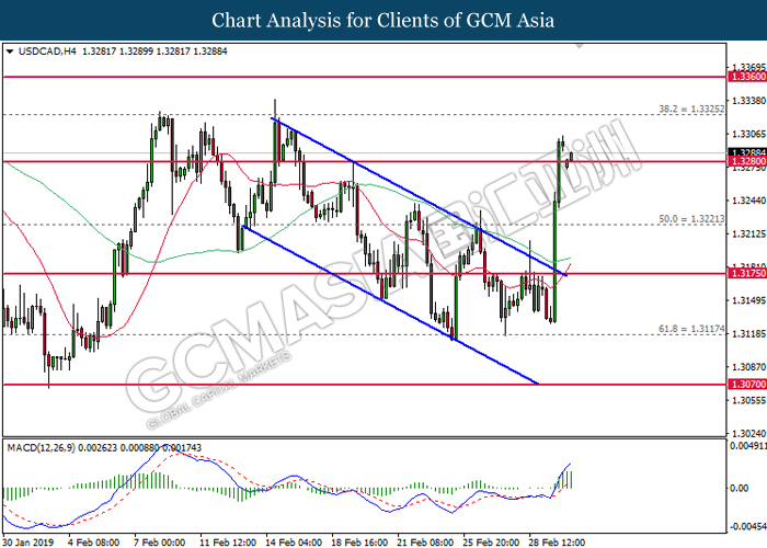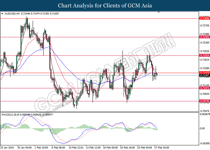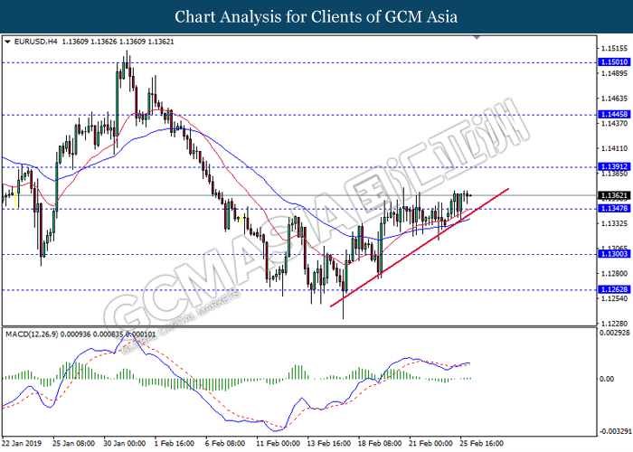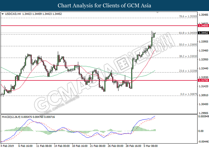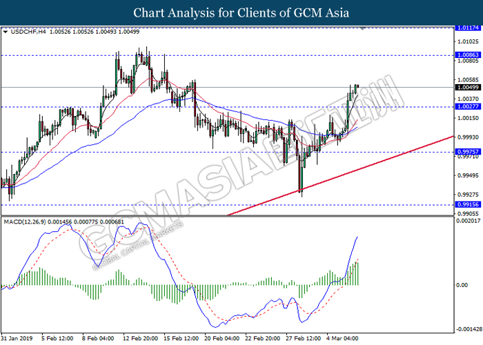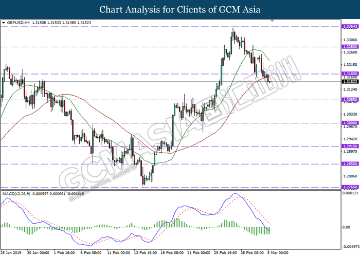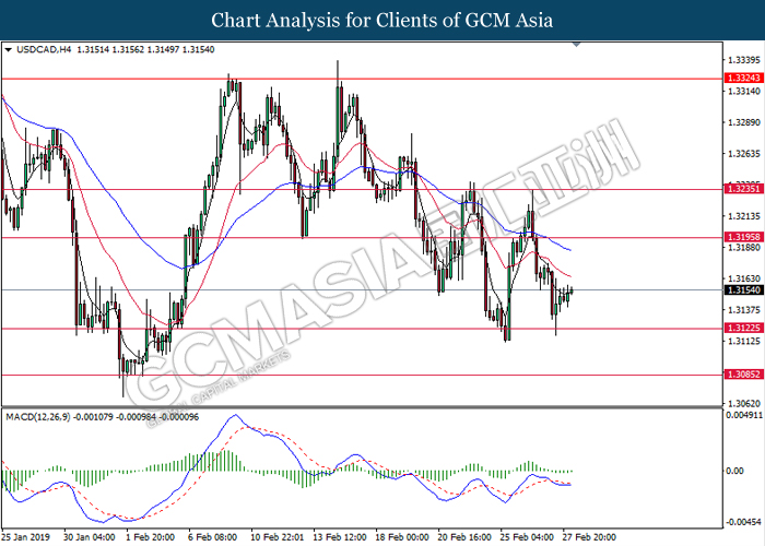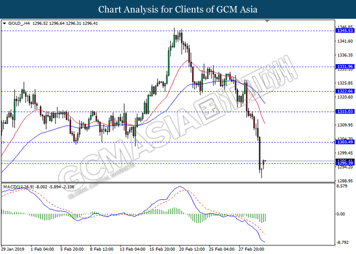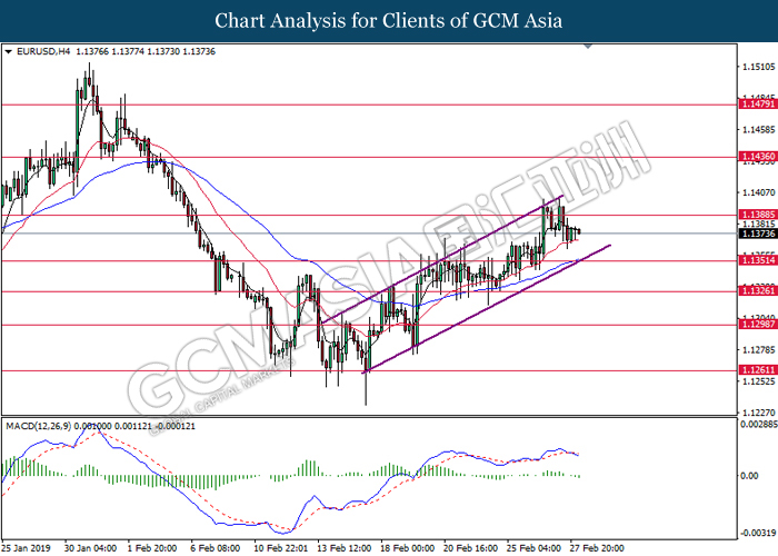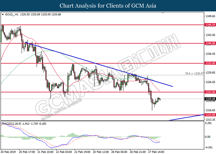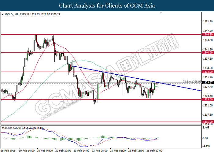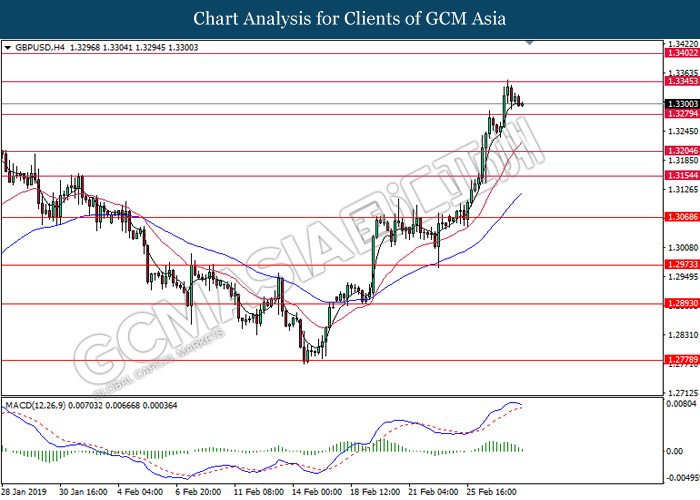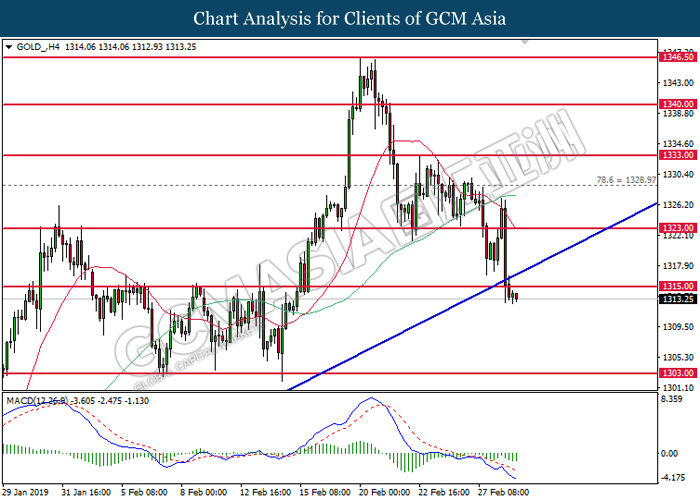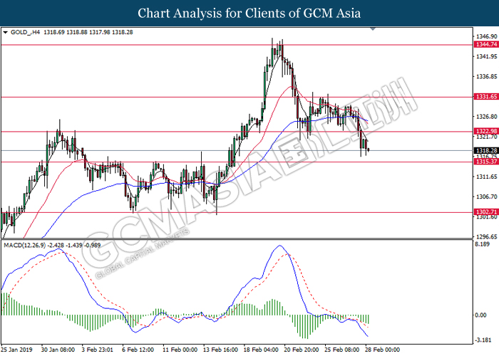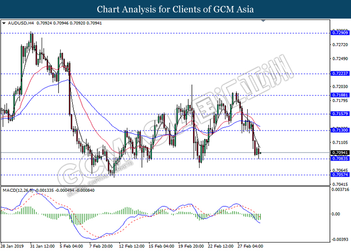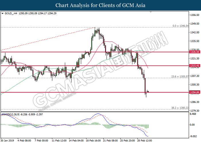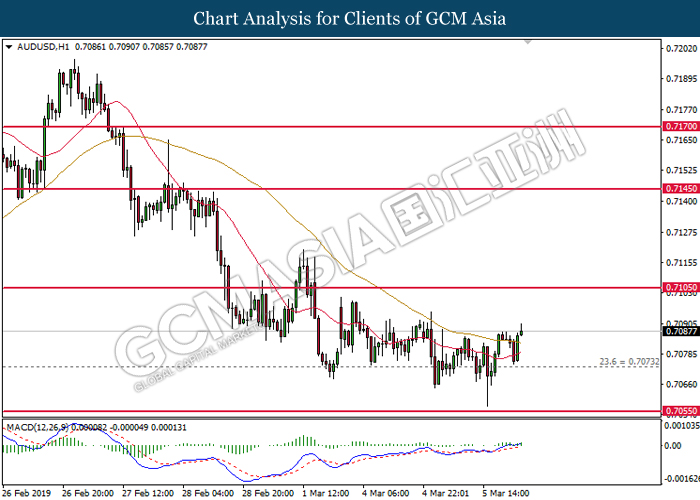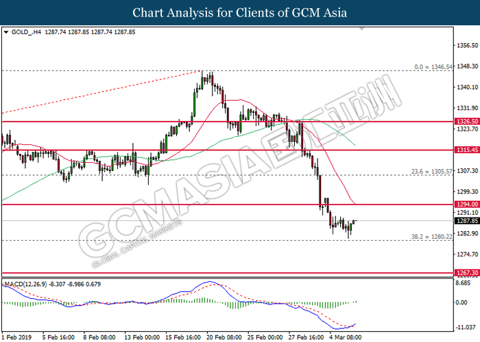 Dollar index hovered near weakest point in one week after FOMC Member Clarida has given out dovish tilt tone on the current economy outlook. According to his speech on yesterday, he emphasized that a pause on tightening policy decision was a brilliant move as the current economy is running close to full employment and inflation level is getting near to the Federal Reserve target. In order to remain economy resiliency, Fed policymakers have showed that they are in favor to be patient where ‘freezing’ the lending rate at ‘neutral’ before continue their tightening plan. As of now, investor keep their eyes on Fed Chairman Powell Testifies before entering into the market as testifies on economy outlook and recent monetary policy action will determine the future trends of Greenback. Dollar index inched down 0.05% to 96.35 during Asian trading session. On the other hand, the pair of GBP/USD surged 0.32% to 1.3135 after Theresa May said she is considering to a plan to further extend the Brexit deadline and avoid U.K. leaving the European Union with no deal next month. With an extension on deadline, there would be more sufficient time to negotiate between U.K. and EU on Brexit unsolved issue especially the backstop of Northern Ireland.
