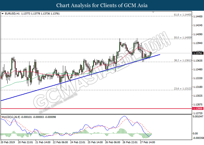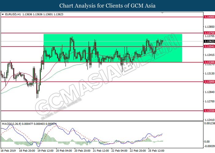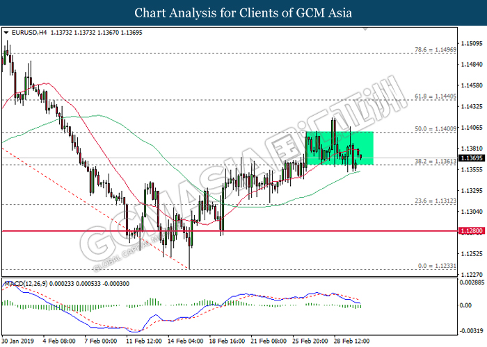 EURUSD, H1: EURUSD was traded higher following prior closure above the resistance at 1.1355. However, due to the lack of signal from MACD and price action, it is suggested to wait for a breakout before entering the market.